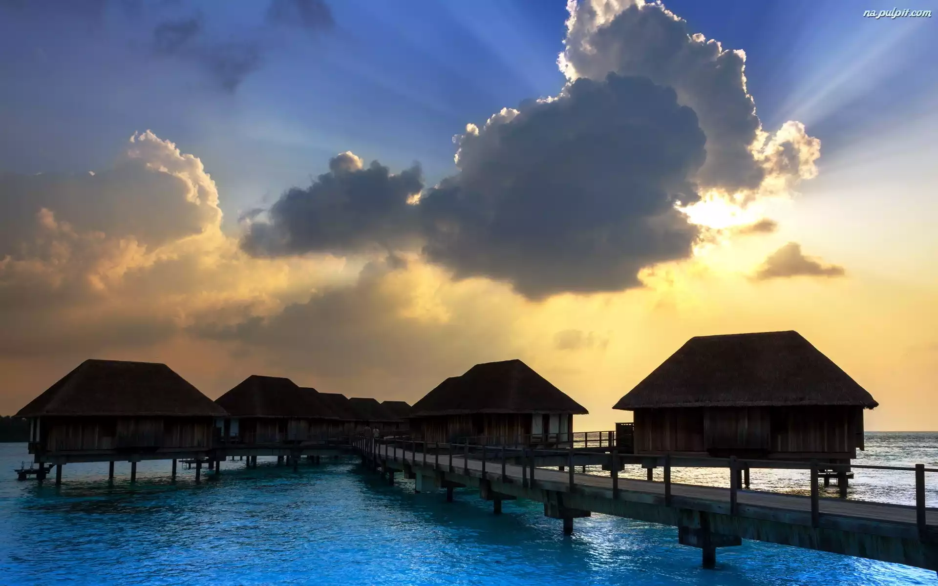 Domki, Morze, Słońca, Zachód, Molo Na Pulpit