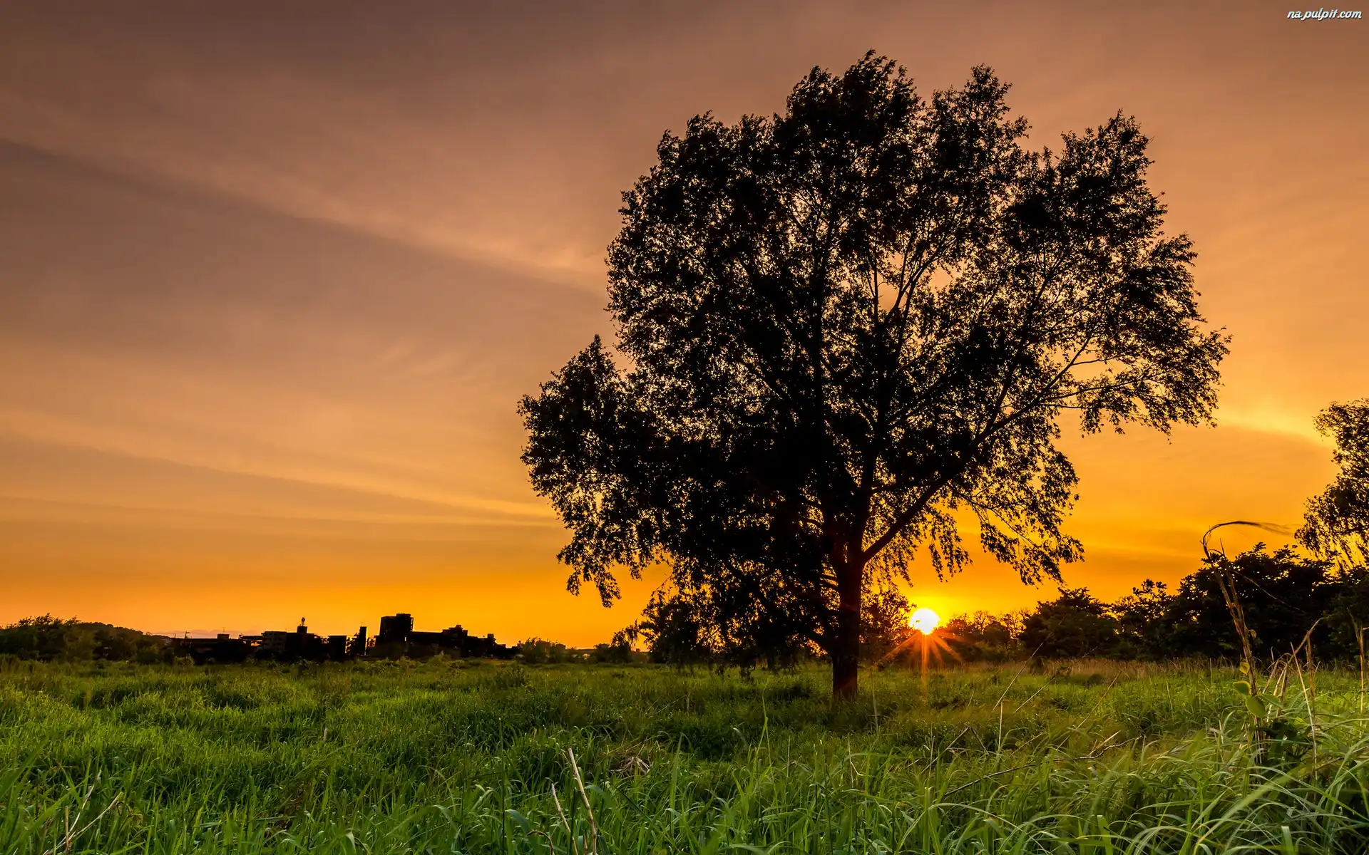 Domy, Zachód słońca, Łąka, Drzewa Na Pulpit