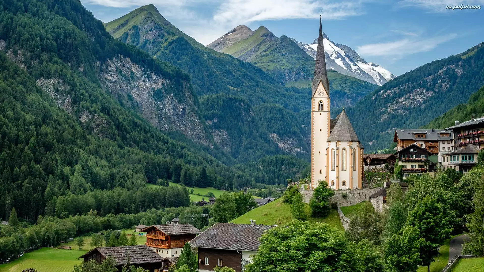 Domy, Heiligenblut am Großglockner, Drzewa, Kościół św. Wincentego z Saragossy, Góry Alpy, Austria, Lasy Na Pulpit |