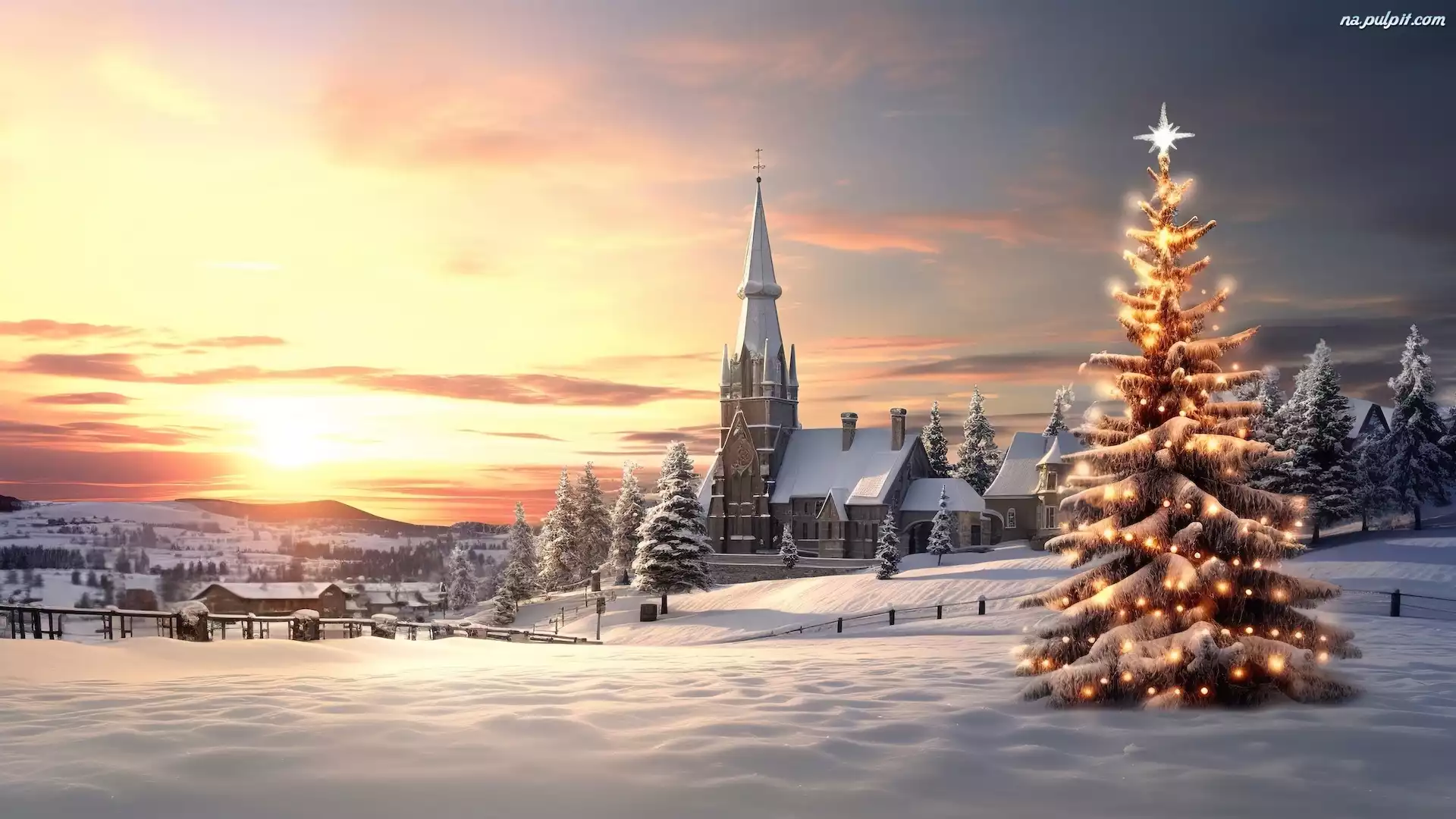Drzewa, Zima, Choinka, Domy, Kościół, Boże Narodzenie Na Pulpit