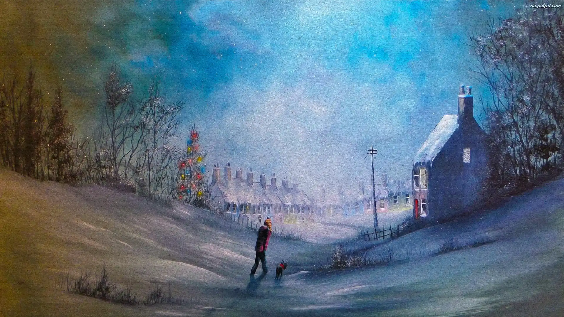 Domy, Pies, Grafika, Zima, Drzewa, Dziecko