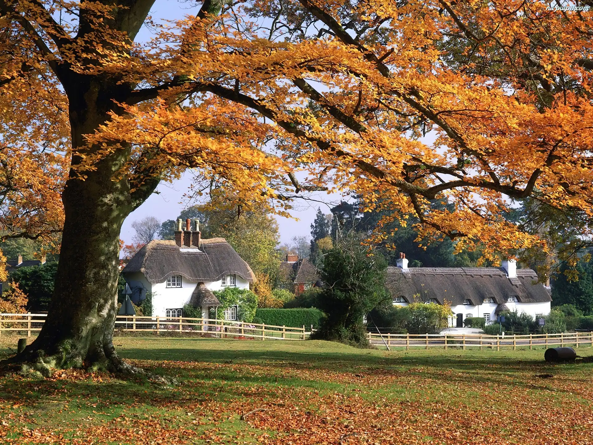 Domy, Żółte, Drzewo, Duże, Liście Na Pulpit