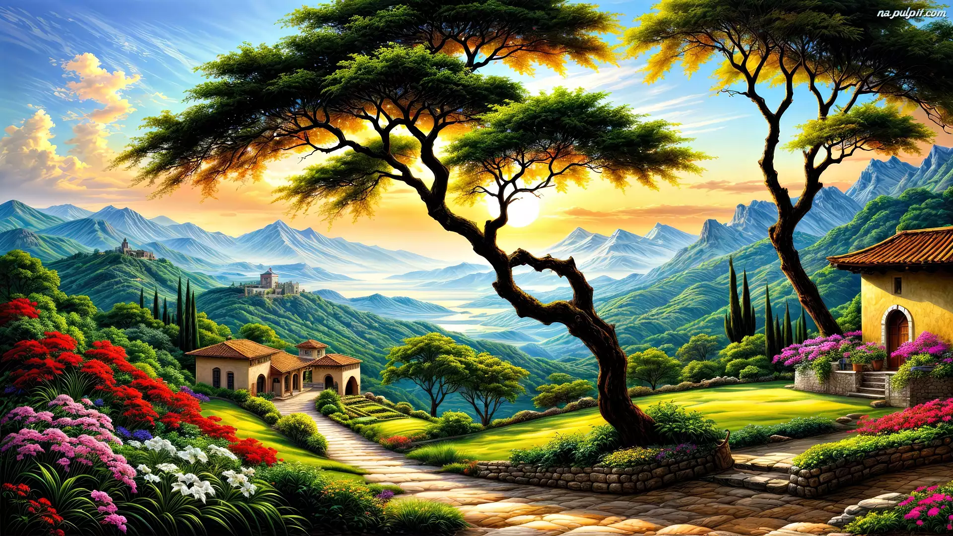 Zachód słońca, Drzewa, Domy, Grafika, Góry Na Pulpit
