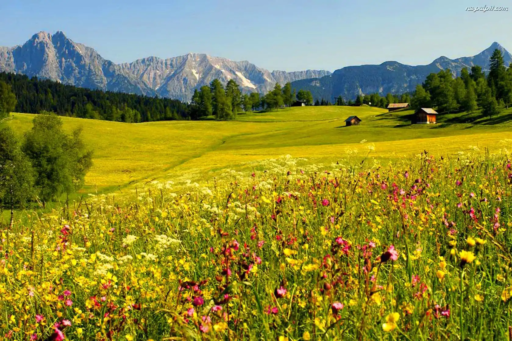 Domy, Łąki, Lasy, Góry, Kwiaty Na Pulpit