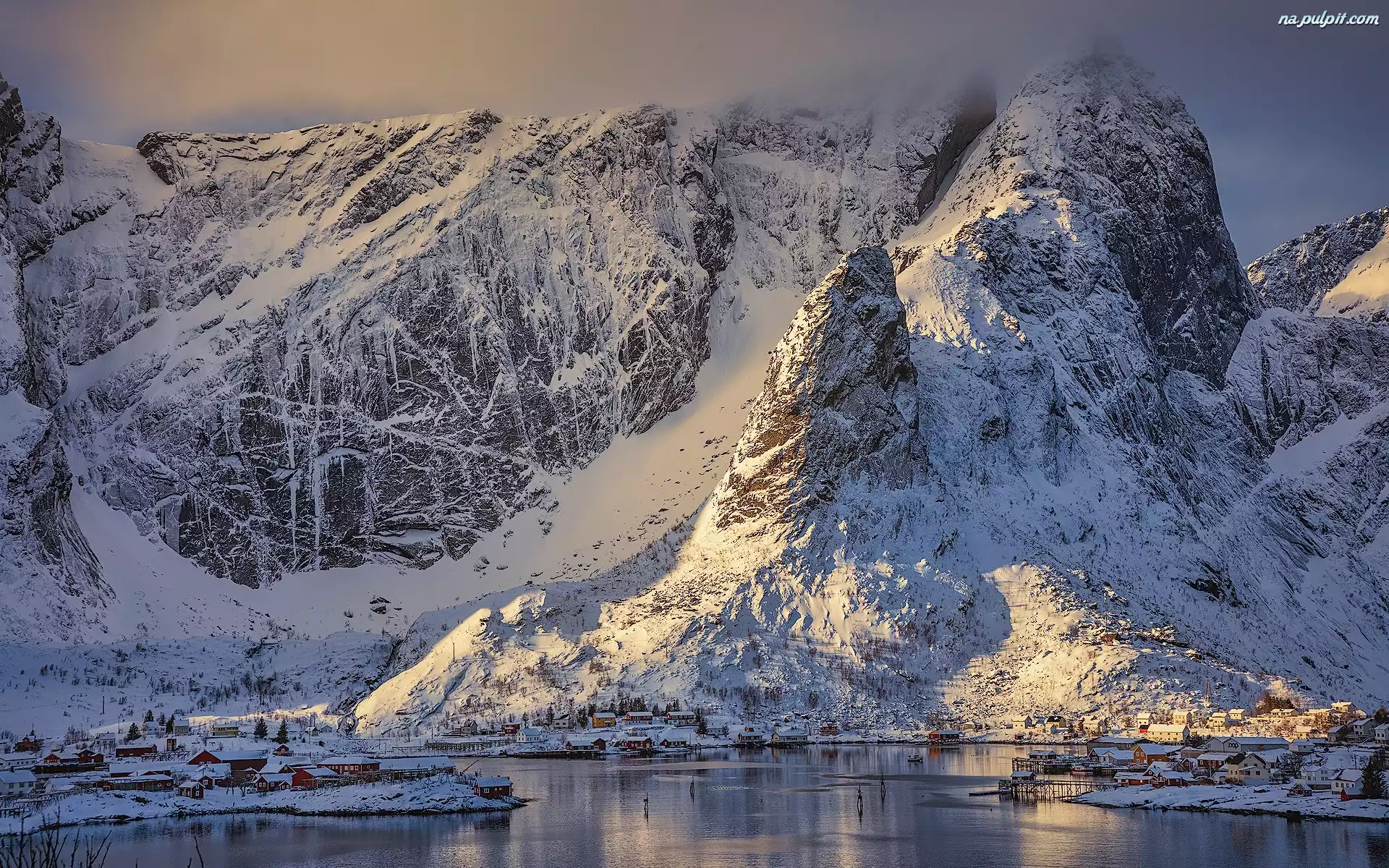Domy, Śnieg, Góry, Jezioro Na Pulpit