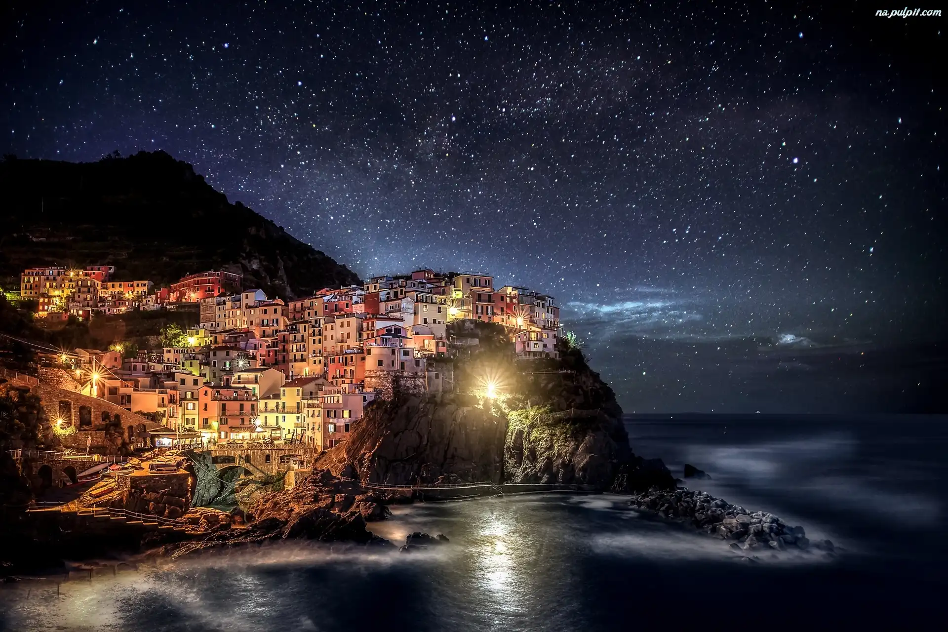Manarola, Noc, Gwiazdy, Park Narodowy Cingue Terre, Włochy, Domy Na Pulpit