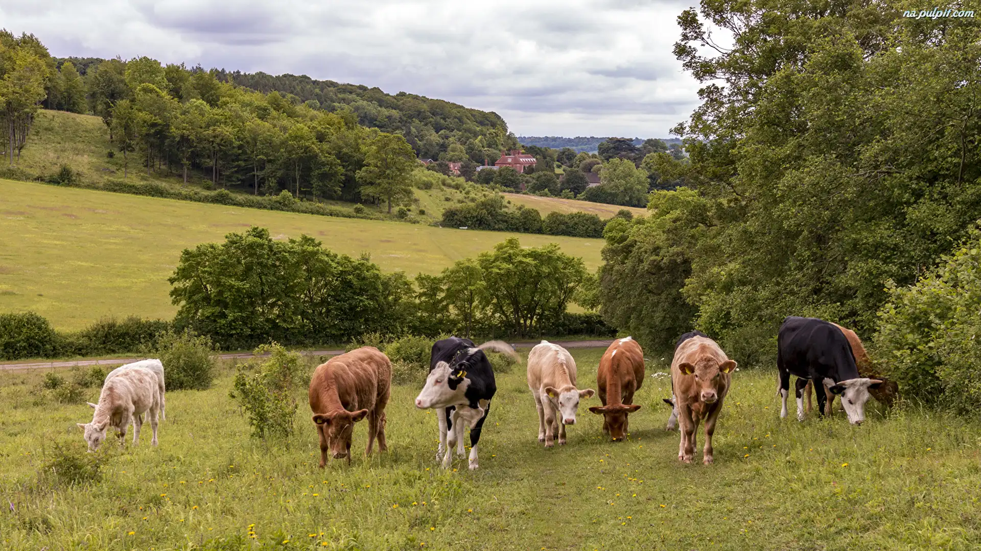 Domy, Trawa, Łąka, Krowy, Drzewa Na Pulpit