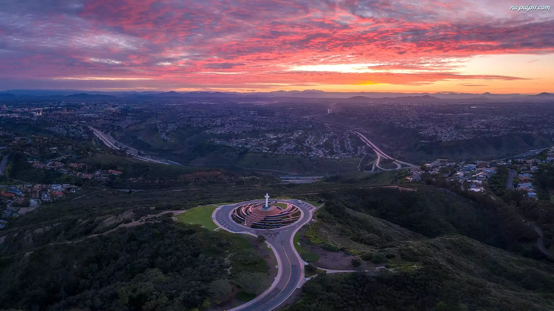 Krzyż, San Diego, Wzgórze, Domy, Zachód słońca, Soledad Mountain, Stany Zjednoczone, National Veterans Memorial Na Pulpit |