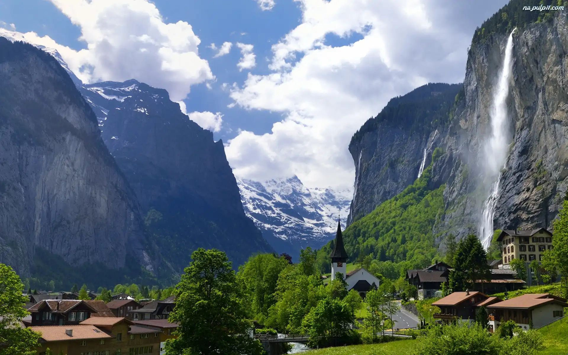 Domy, Wodospad Staubbach, Góry, Szwajcaria, Kanton Berno, Dolina Lauterbrunnental, Kościół Na Pulpit |