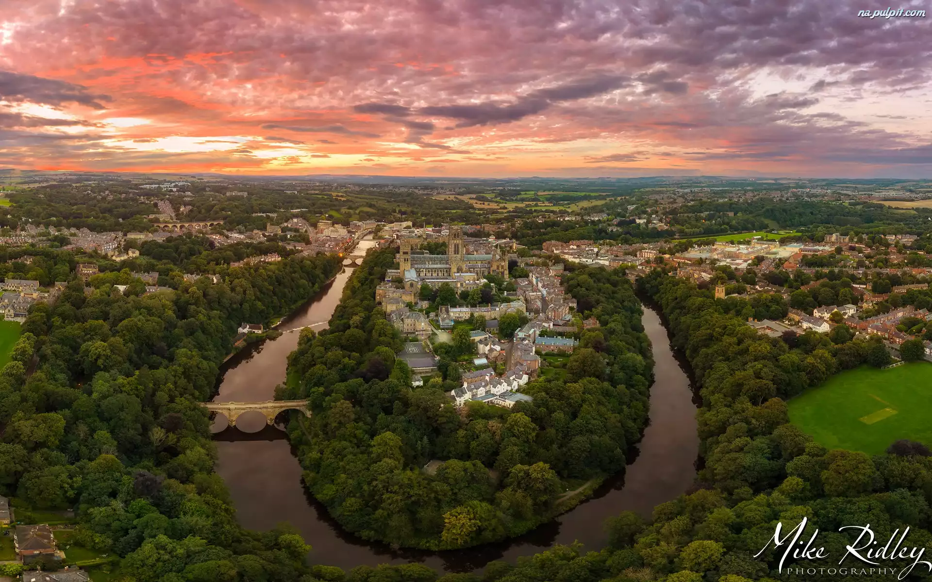 Zachód słońca, Miasto, Chmury, Durham, Rzeka, Durham Cathedral, Anglia, Domy, Katedra, Drzewa Na Pulpit |