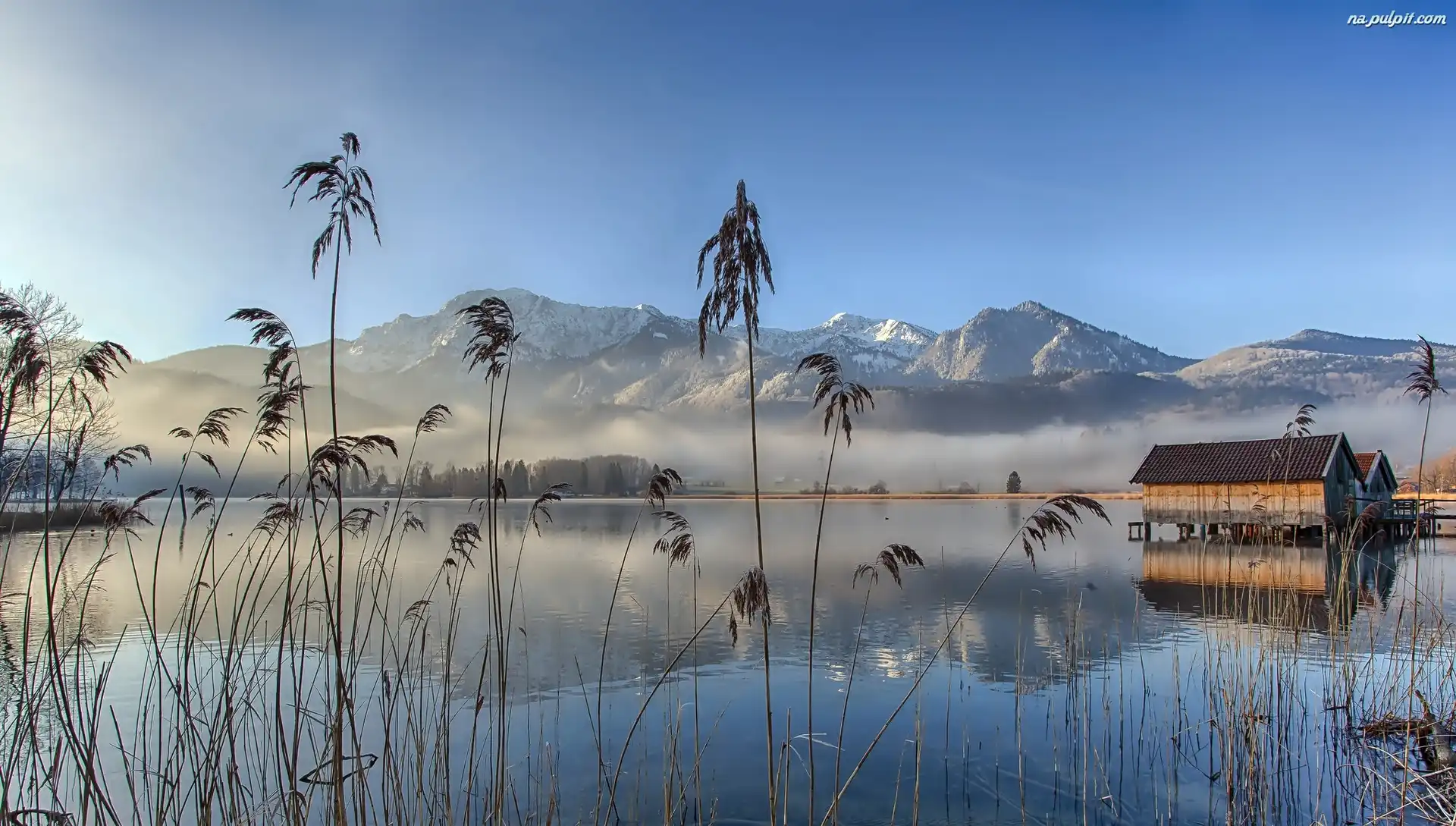 Górskie, Drewniane, Świcie, O, Na, Palach, Trawy, Mgła, Jezioro, Domy Na Pulpit