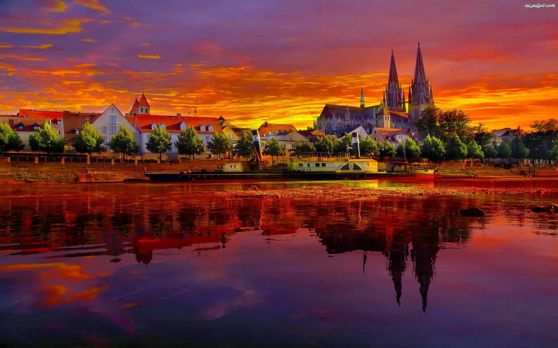 Domy, Słońca, Niemcy, Kościół, Rzeka, Zachód