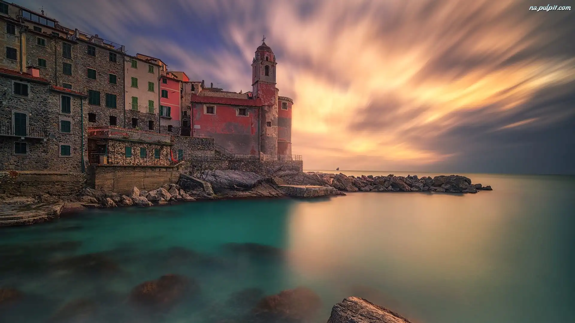 Tellaro, Domy, Wschód słońca, Wybrzeże, Włochy, Skały Na Pulpit