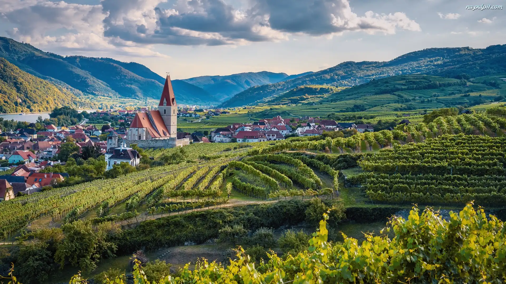 Dolina Wachau, Domy, Góry, Weissenkirchen, Winnice, Plantacja, Chmury, Rzeka, Austria, Roślinność Na Pulpit |
