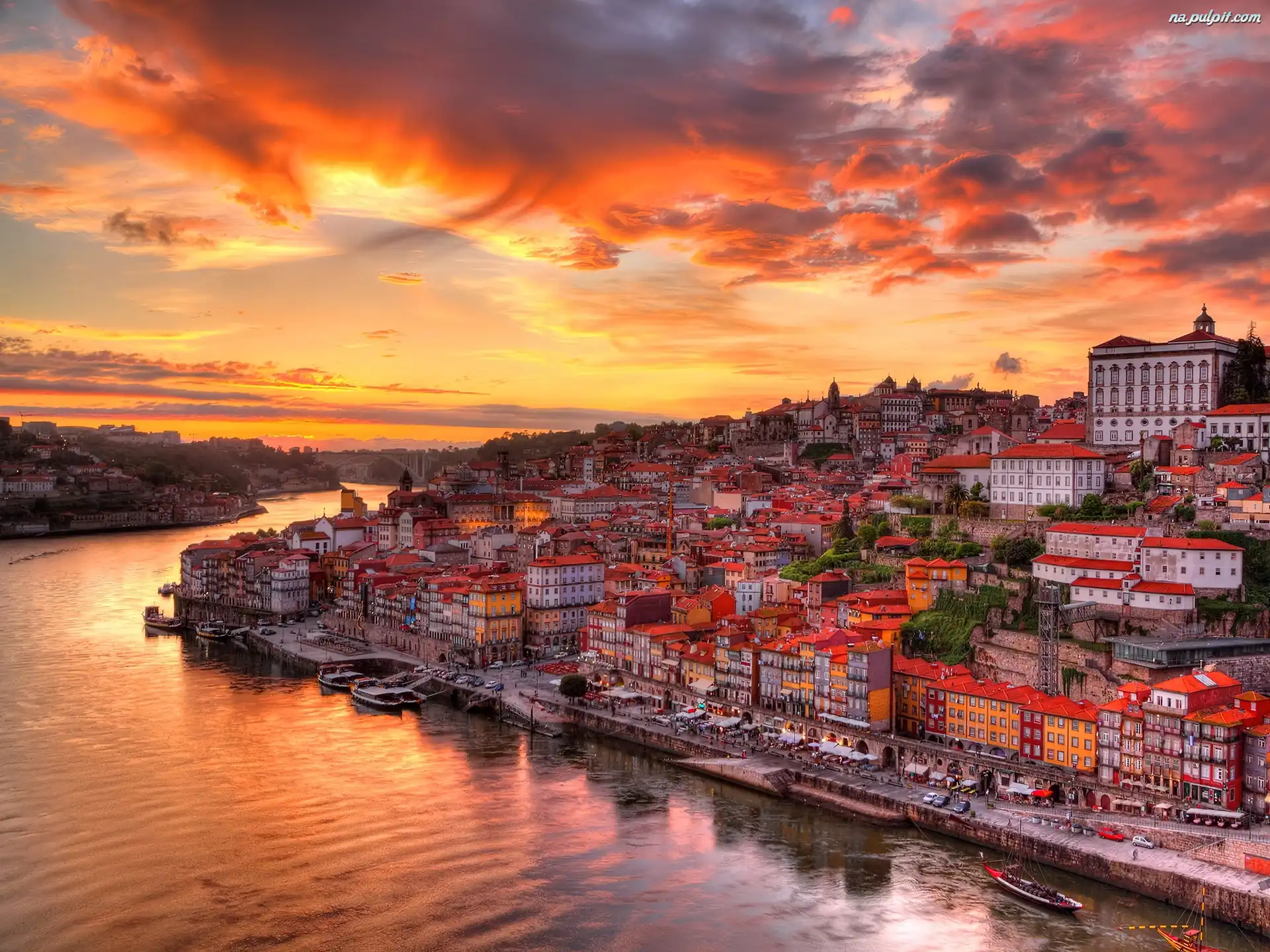Domy, Słońca, Zachód, Rzeka Na Pulpit