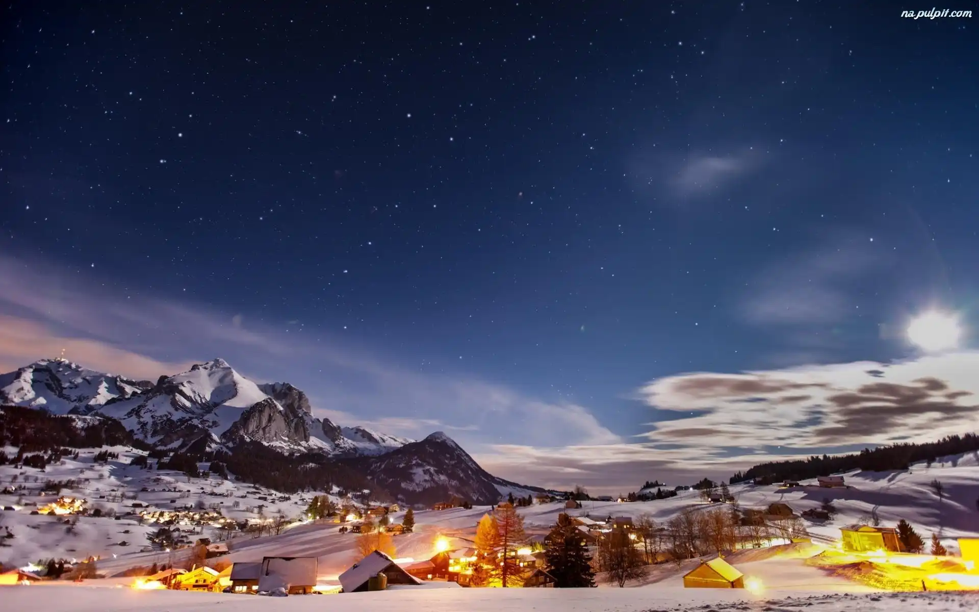 Zima, Domy, Światło, Drogi, Osada, Góry, Przebijające Na Pulpit
