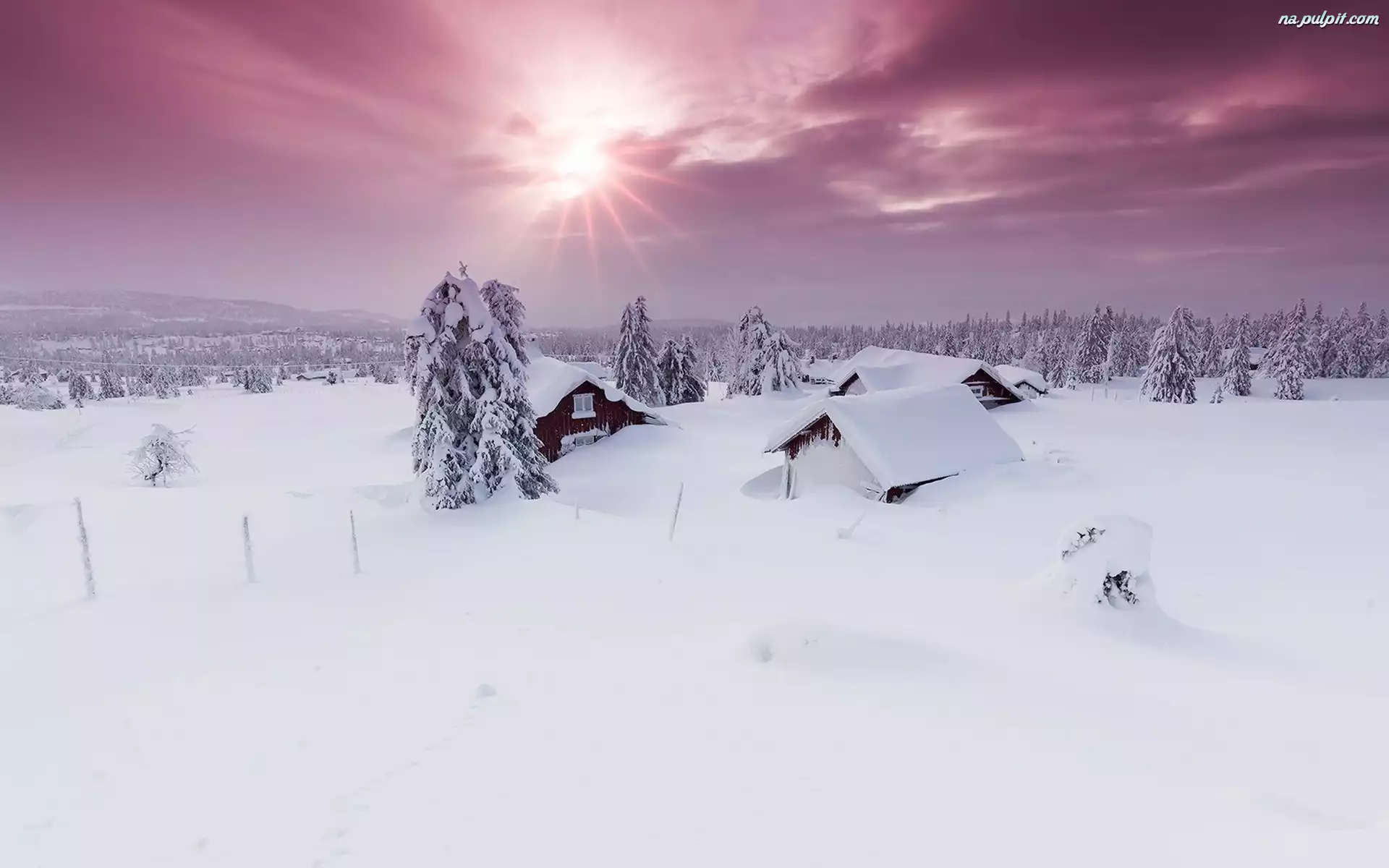 Domy, Promienie słońca, Drzewa, Zima, Zasypane Na Pulpit