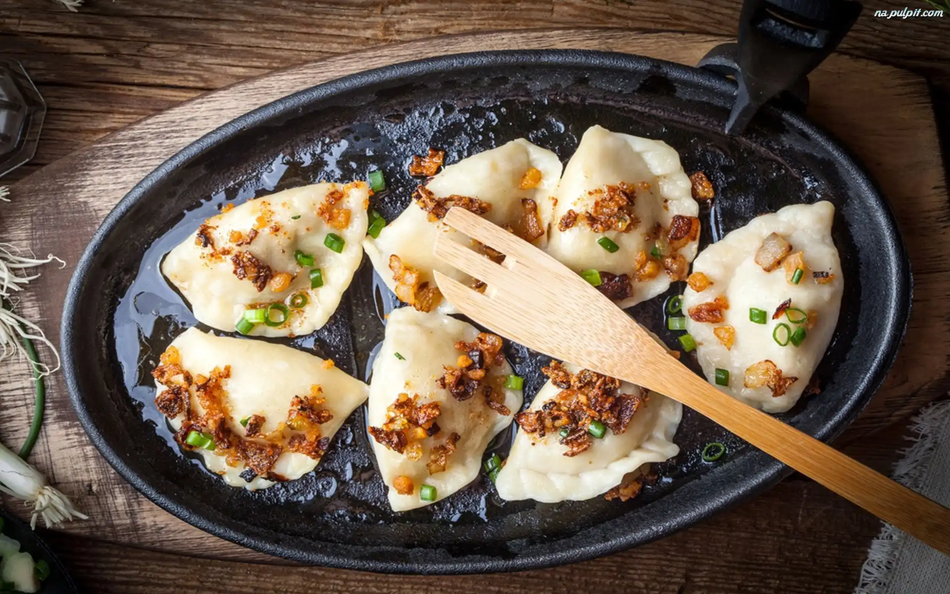 Trzy, Pierogi Drewniana, Patelnia, Pierogi, Łopatka Pierogi, Szczypiorek Smażone, Pierogi Pierogi Sztuczce, Pierogi, Talerz Owoce, Pierogi, Deska Wałek, Pielmieni, Pierogi, Deska Wałek, Mąka, Uszka, Jajko Pierogi, Rosół Domowe, Pierogi
