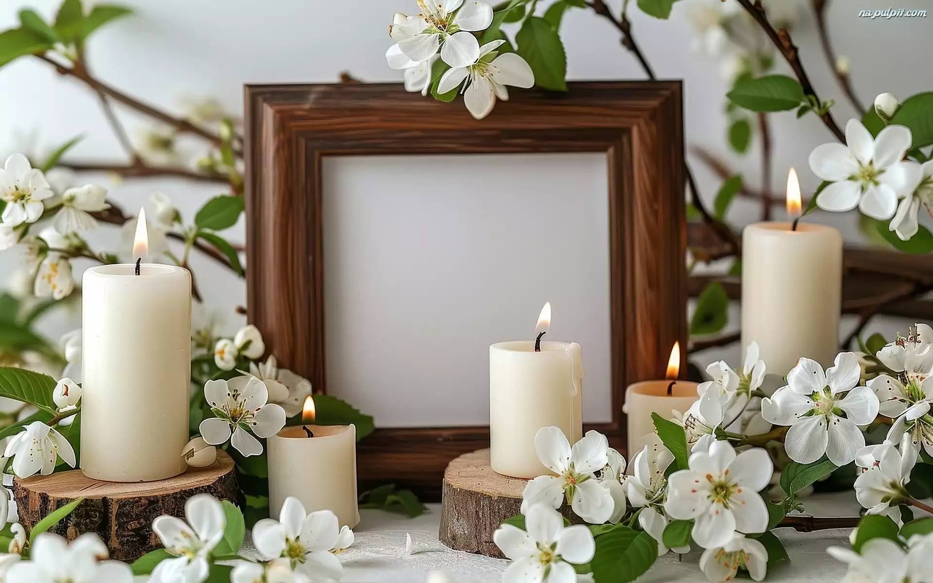 Kłody, Ramka, Gałązki, Świece, Kwiaty, Białe, Drewniana, Drewniane Na Pulpit