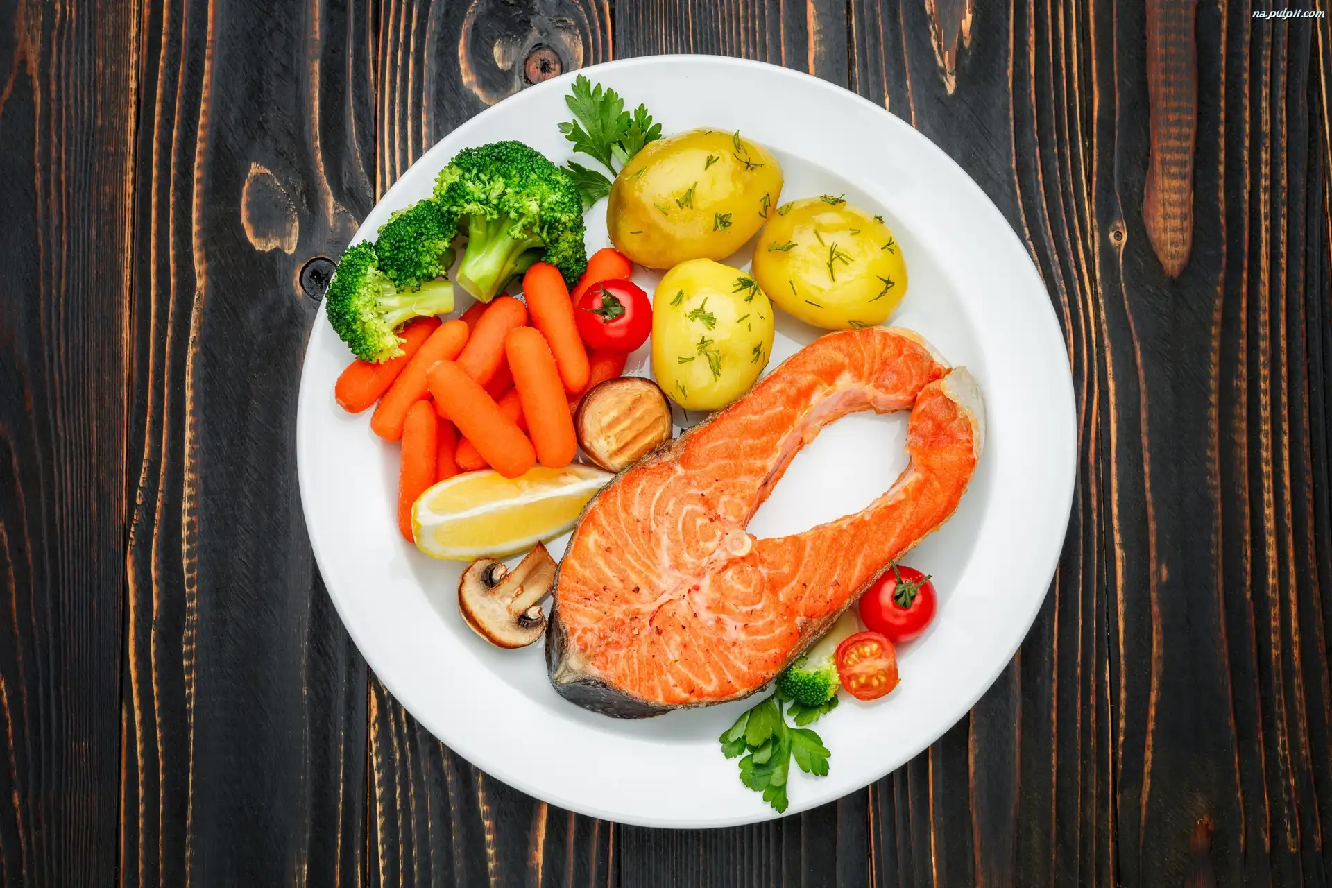 Drewniany, Talerz, Blat, Biały, Ziemniaki, Marchewka, Obiad, Ryba, Brokuły, Pomidory Na Pulpit