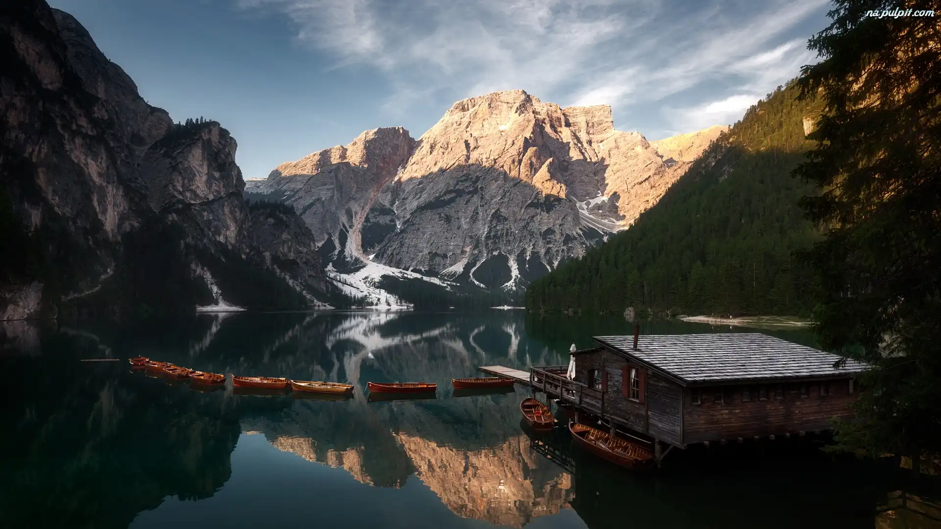 Drewniany, Jezioro Pragser Wildsee, Lago di Braies, Domek, Łódki, Góry Dolomity, Włochy, Pomost Na Pulpit |