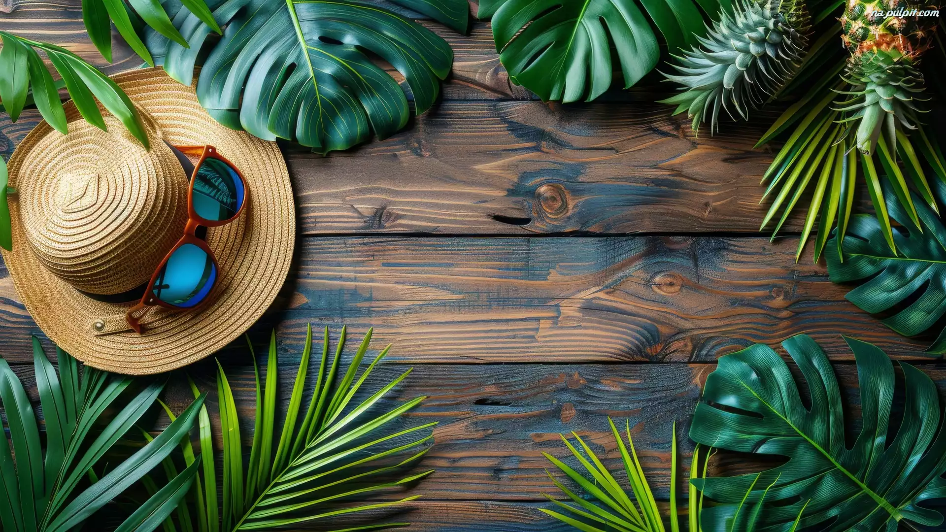 Deski, Kapelusz, Liście, Drewno, Okulary, Kompozycja