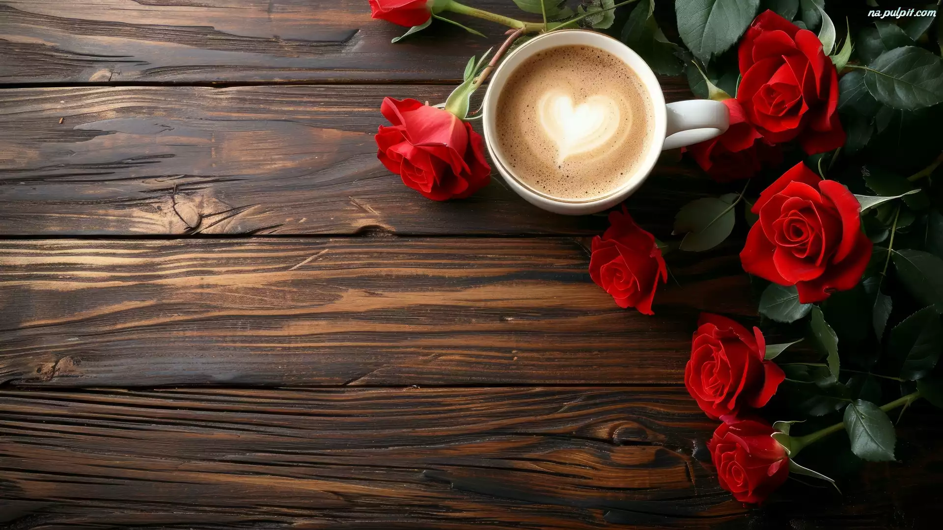 Kubek, Kawa, Róże, Drewno Na Pulpit