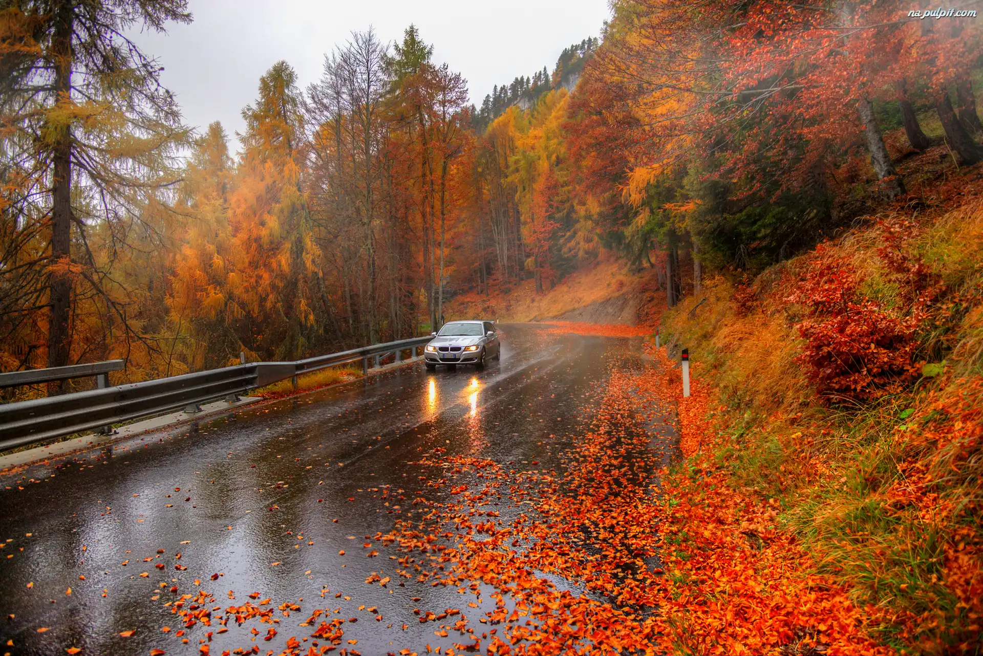 BMW, Droga, Samochód, Drzewa, Las, Jesień, Liście Na Pulpit