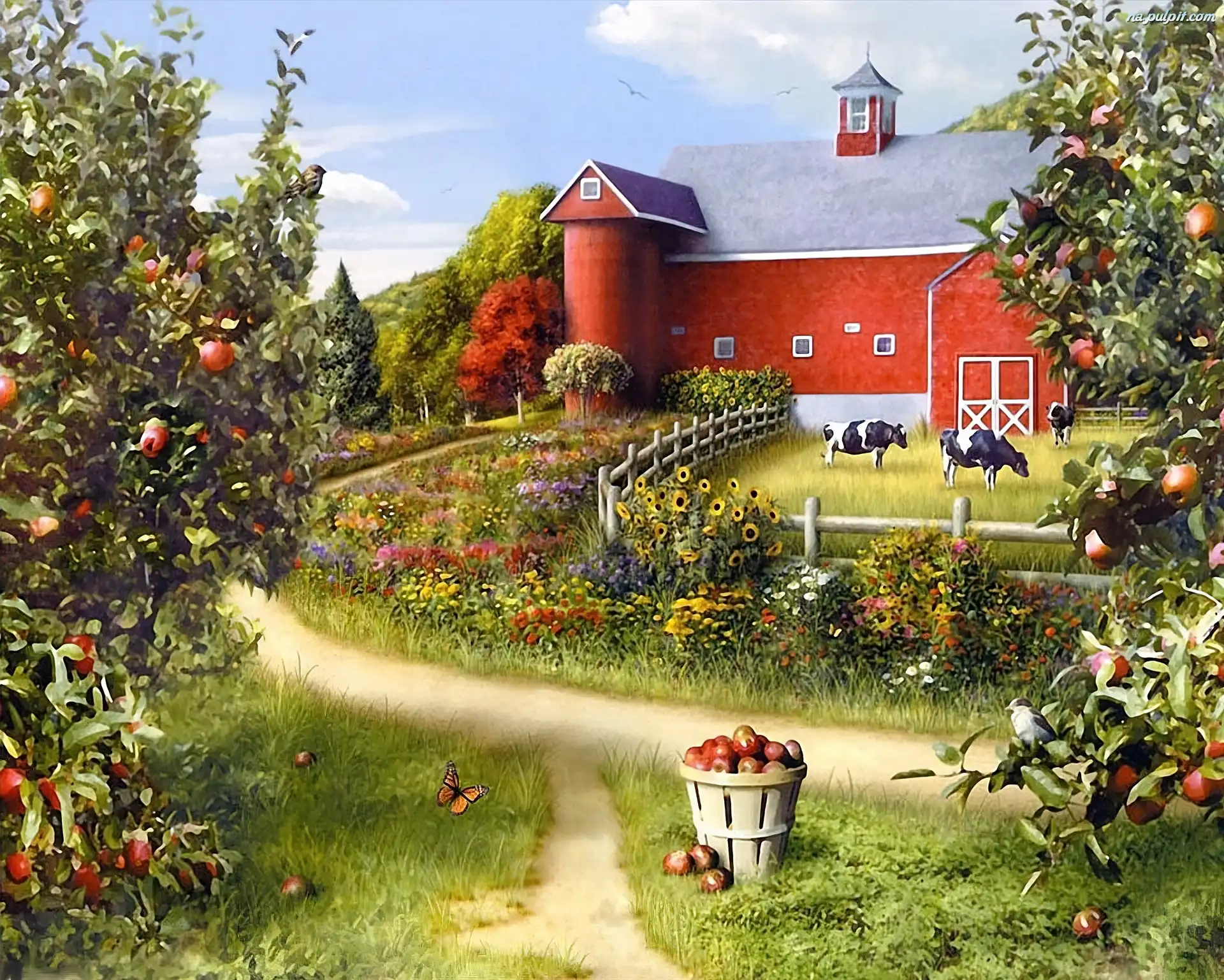 Droga, Jabłka, Sad, Budynek, Krowy Na Pulpit