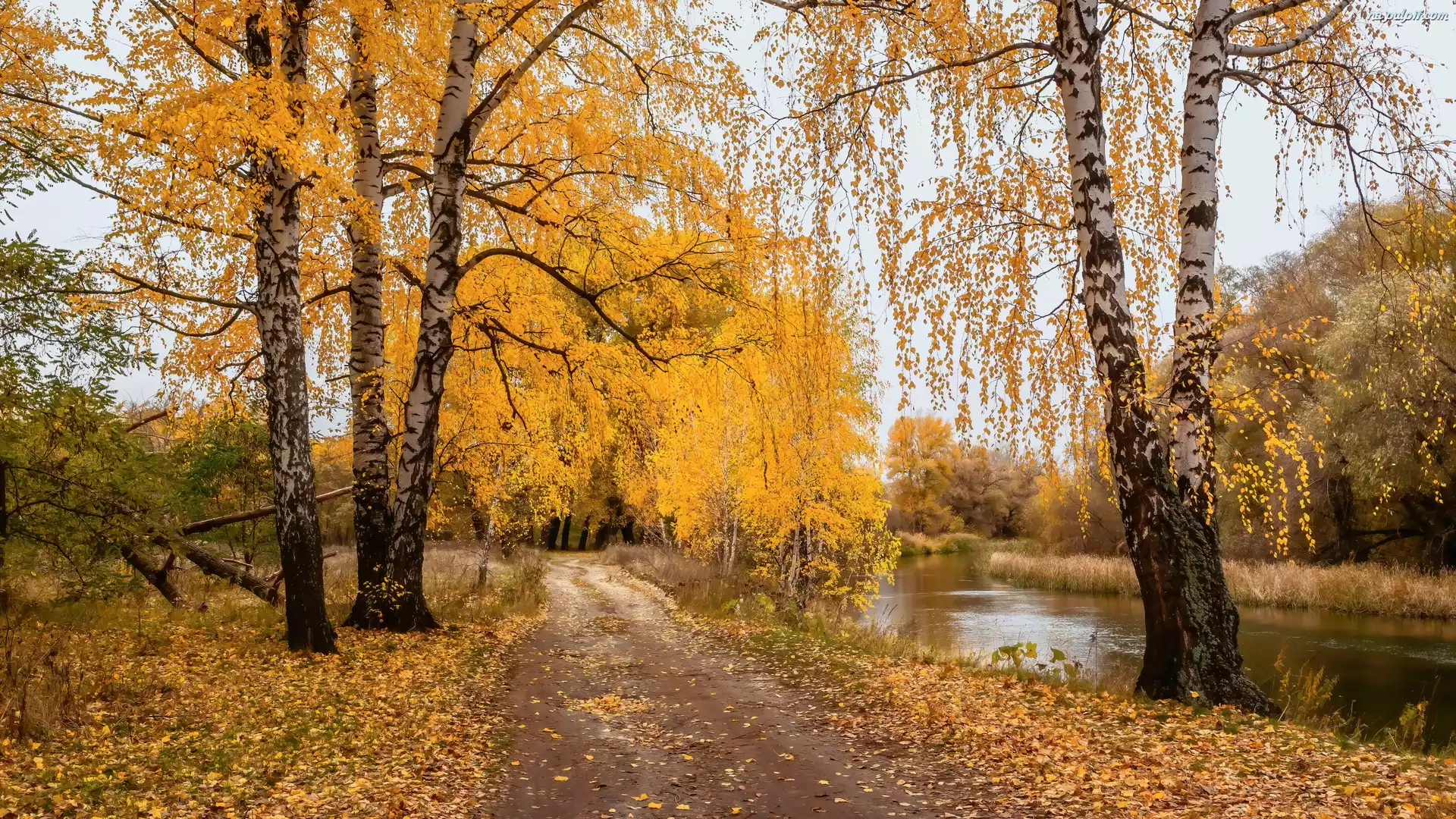 Rzeka, Droga, Drzewa, Jesień, Brzozy Na Pulpit