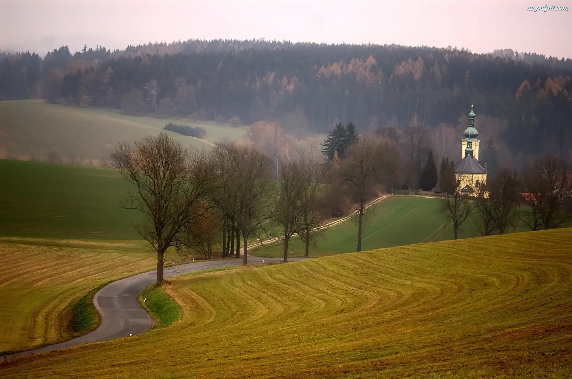 Droga, Budynki, Las, Drzewa, Góry, Pole