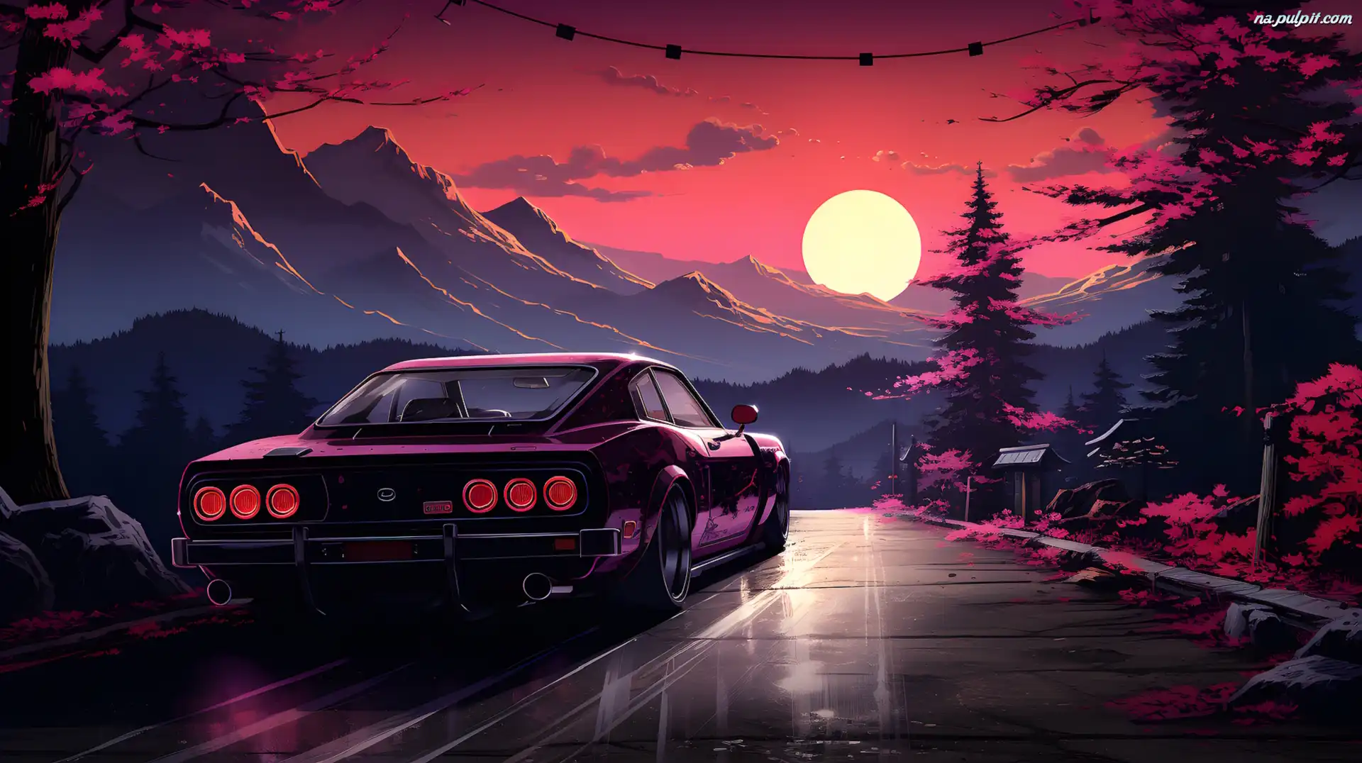 Zachód słońca, Samochód, Droga, Grafika, Góry Na Pulpit