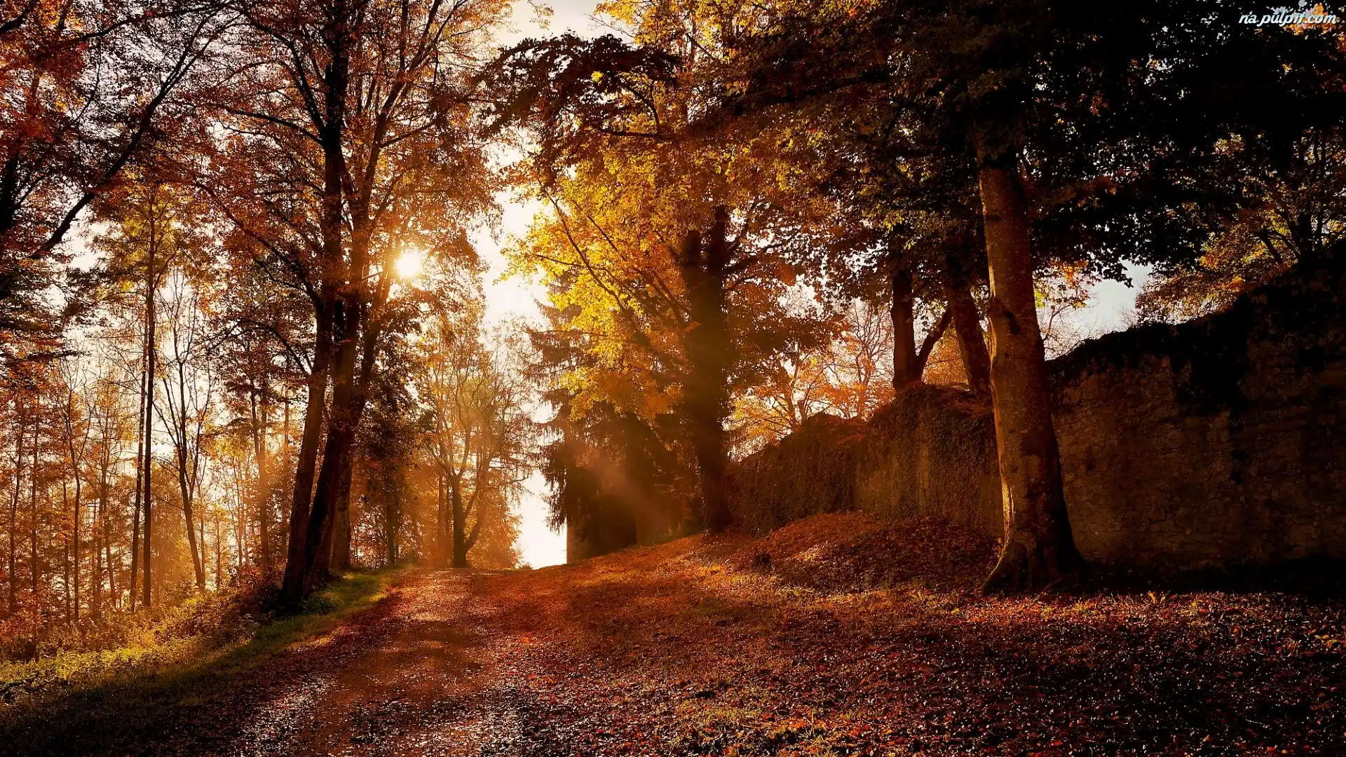 Droga, Słoneczny, Dzień, Drzewa, Jesień, Mur