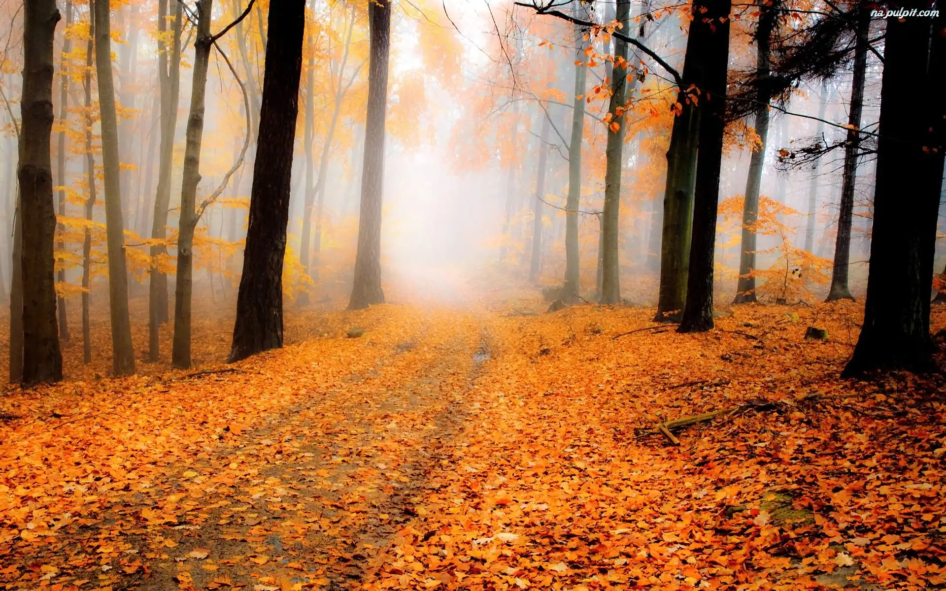 Droga, Mgła, Jesień, Drzewa, Las, Liście Na Pulpit