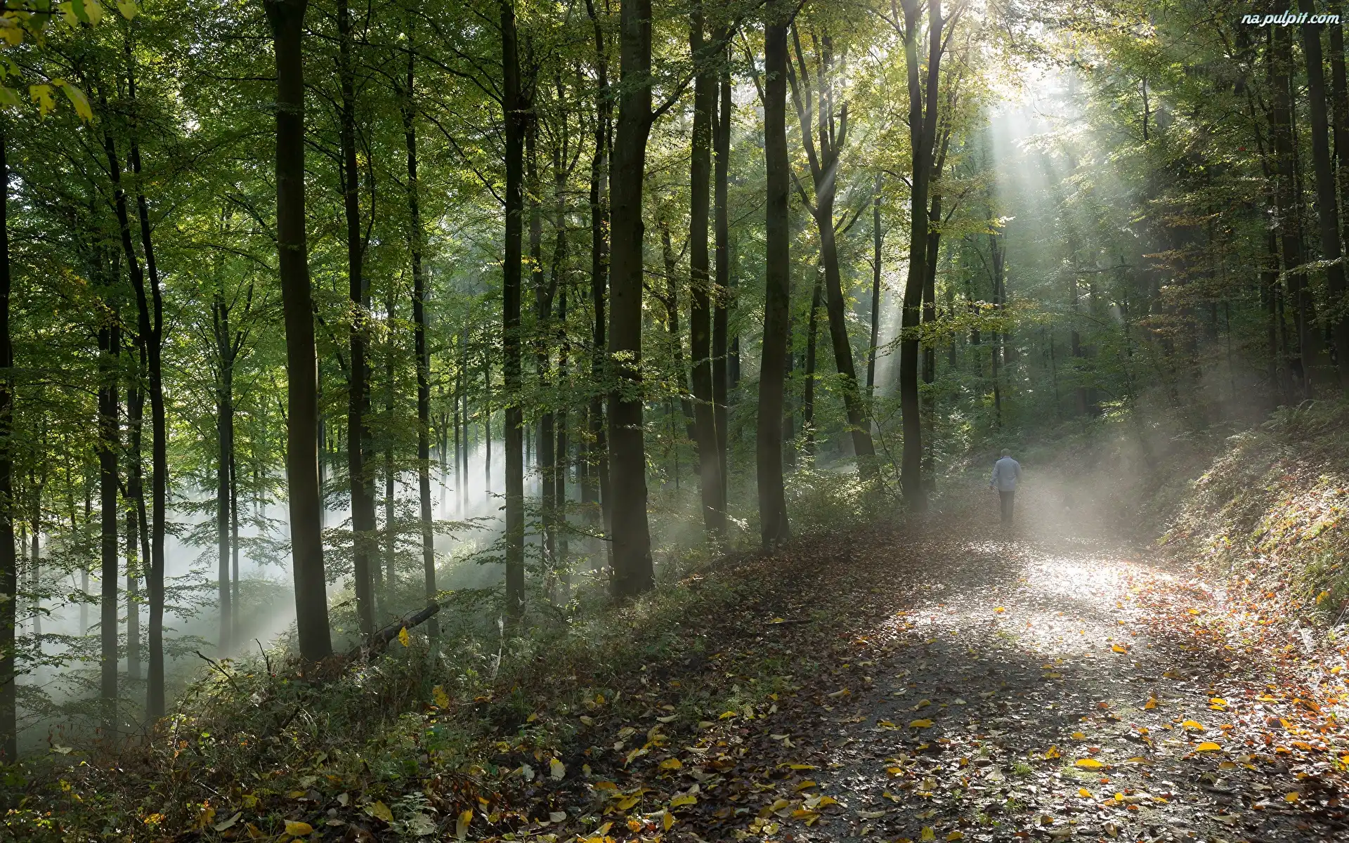 Droga, Przebijające światło, Drzewa, Las, Słoneczne