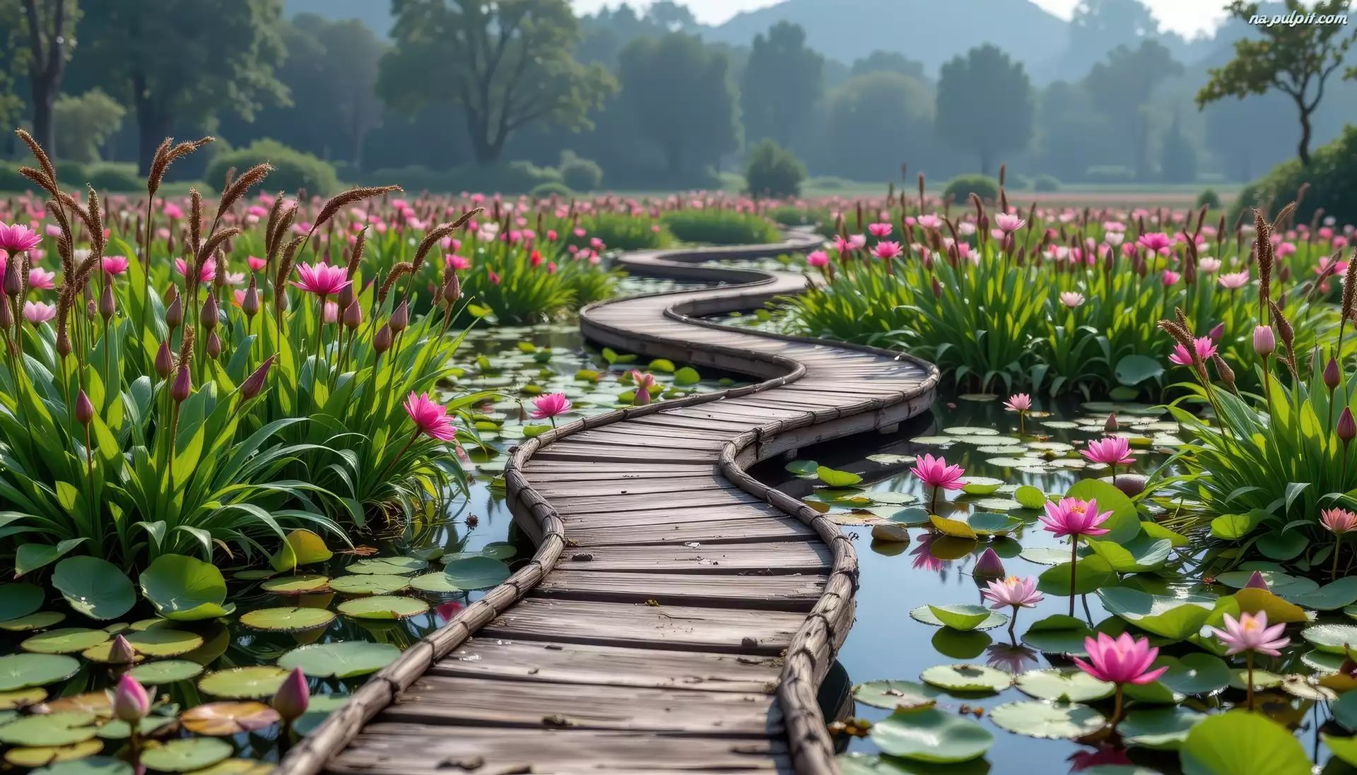 Trzciny, Kładka, Lilie wodne, Kwitnące, Kwiaty, Grafika Droga Na Pulpit