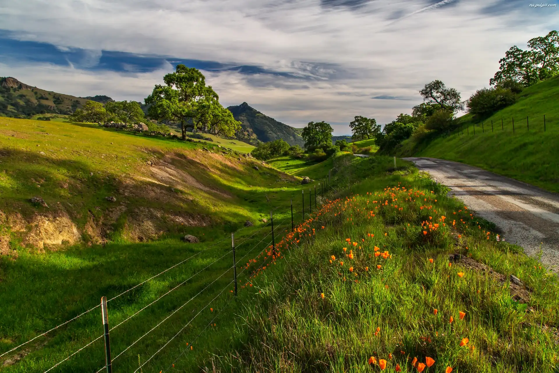Droga, Światło, Cień, Łąka, Wzgórza, Maki
