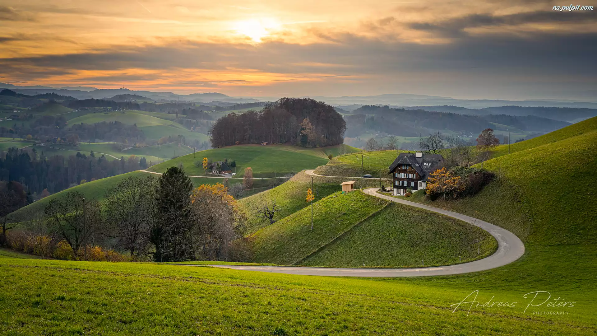 Zachód słońca, Wzgórza, Droga, Drzewa, Dom, Góry Na Pulpit