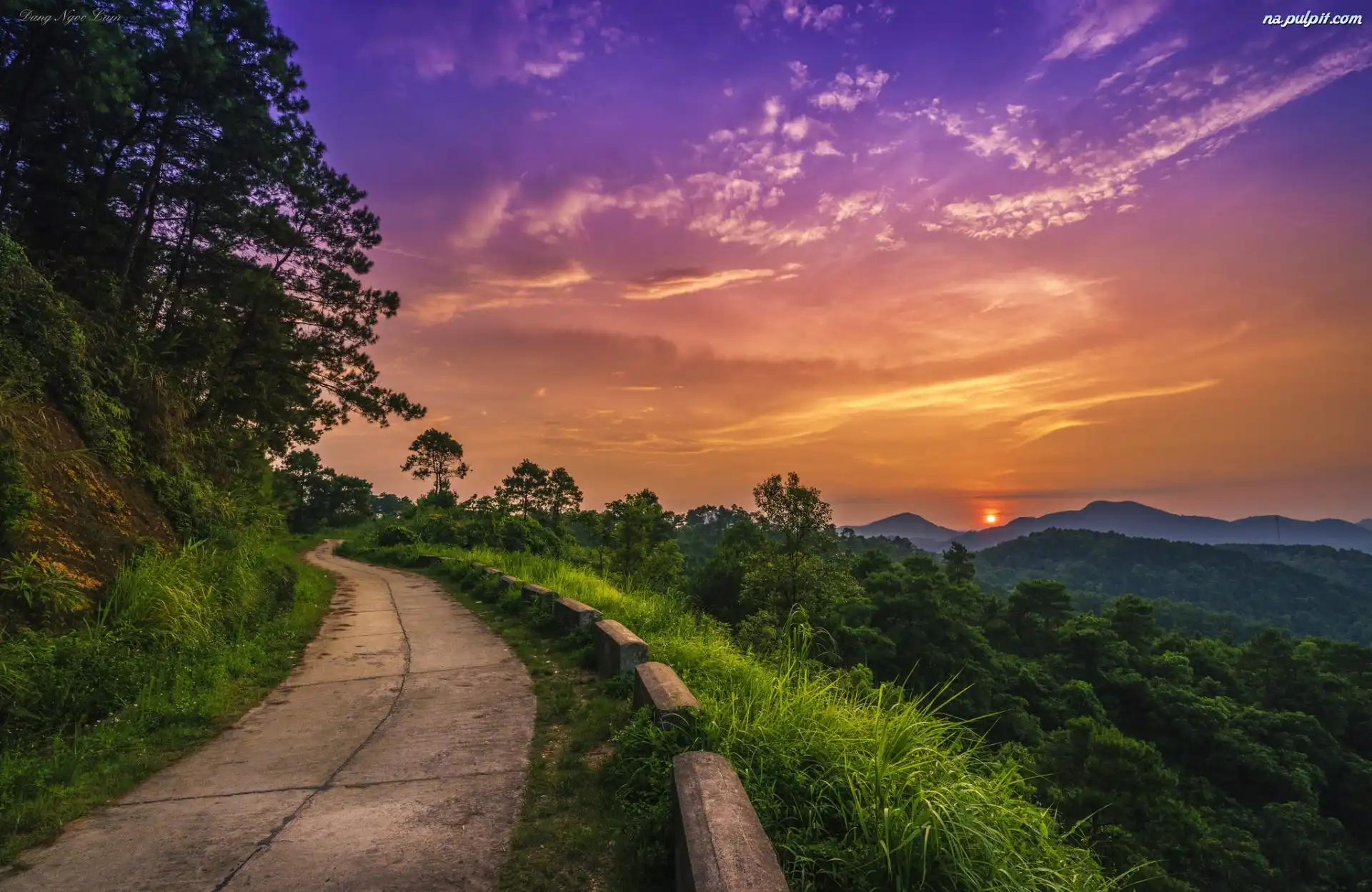 Droga, Zachód słońca, Wzgórza, Drzewa