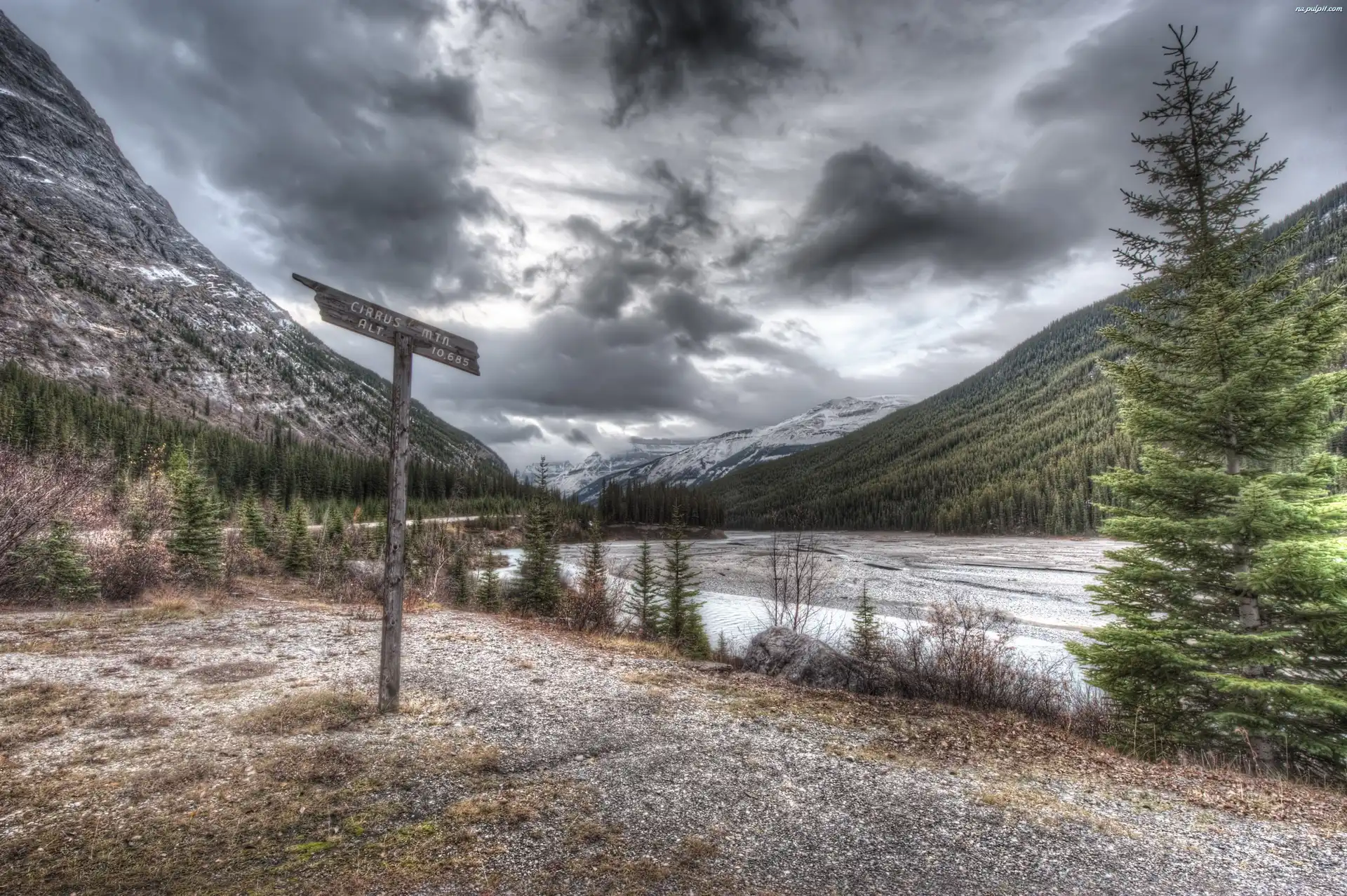 Drogowskaz, Góry, Chmury, Rzeka