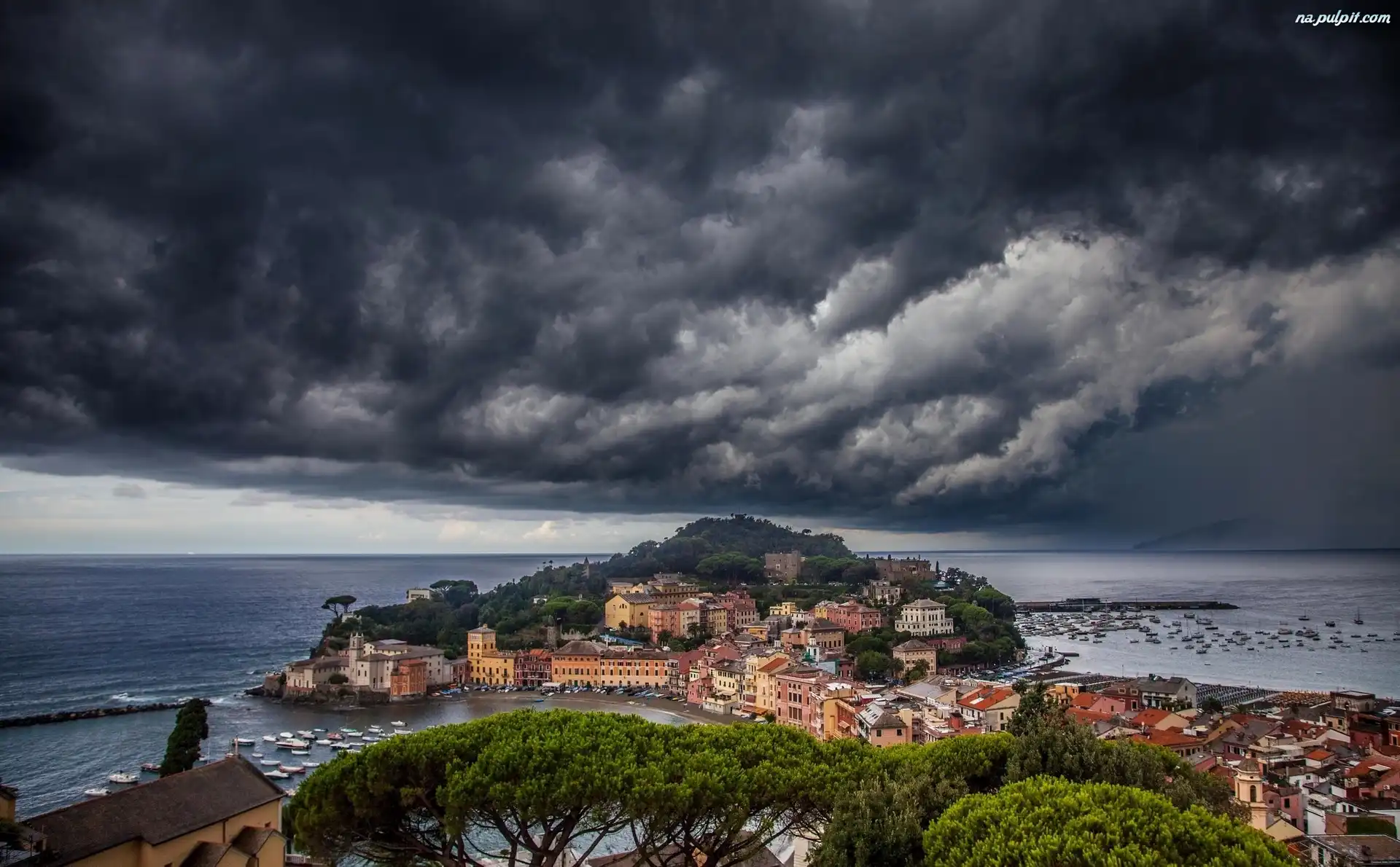 Drzew, Chmury, Miasto, Morze, Wierzchołki Na Pulpit