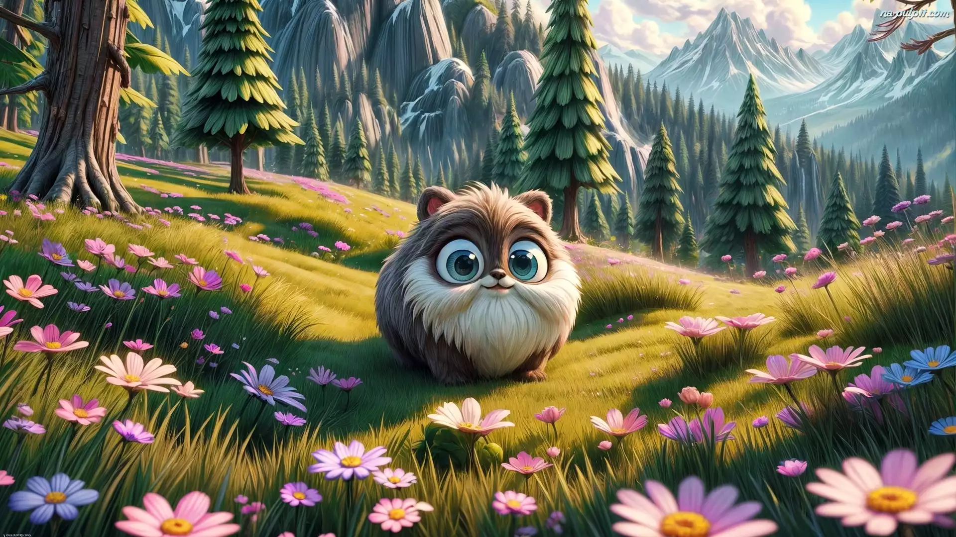 Góry, Stworek, Polana, Drzewa, Kwiaty, AI Na Pulpit
