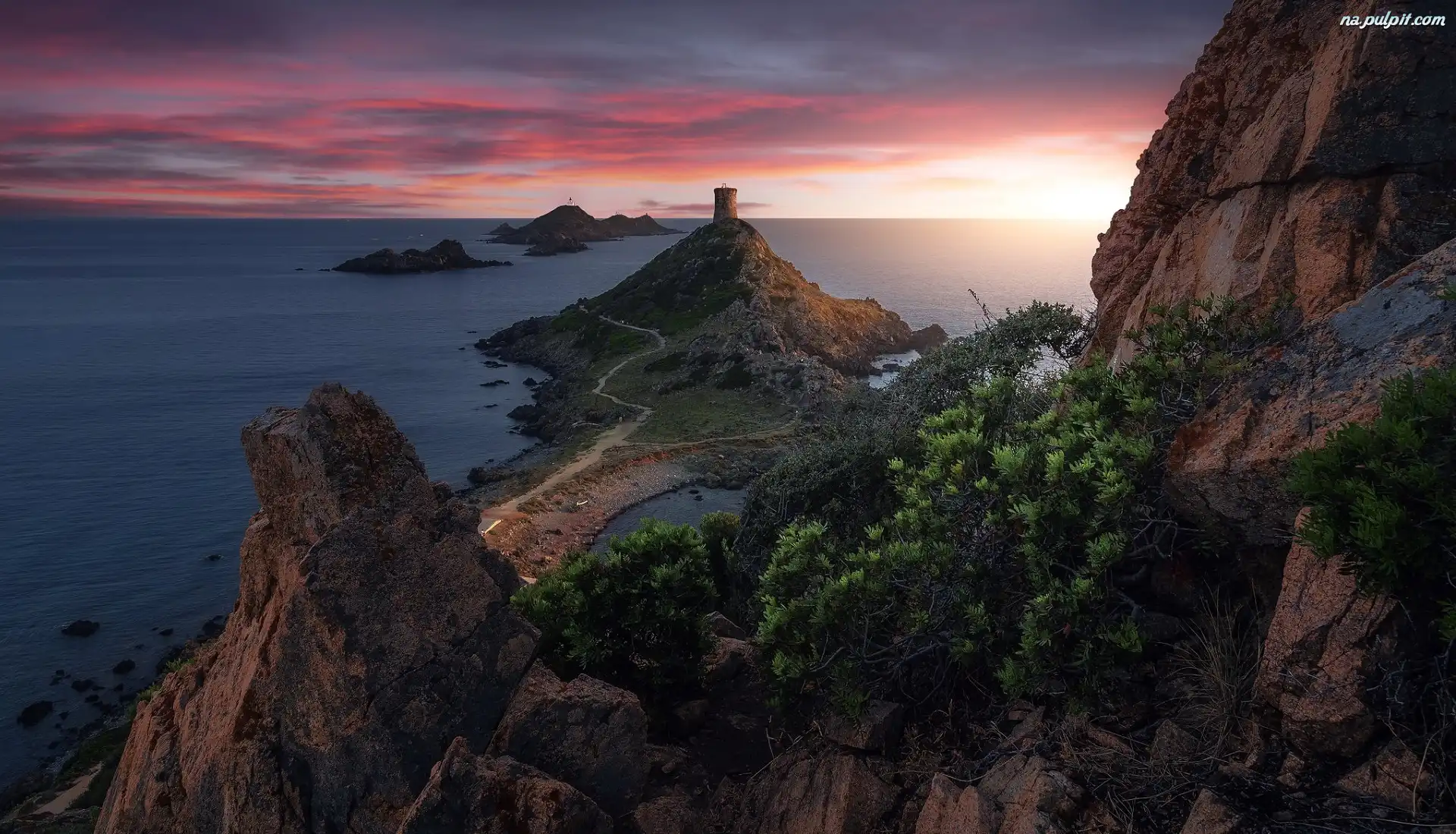 Ajaccio, Morze Śródziemne, Latarnia, Drzewa, Korsyka, Francja, Skały, Wyspa Archipel des Sanguinaires, Zachód słońca Na Pulpit |