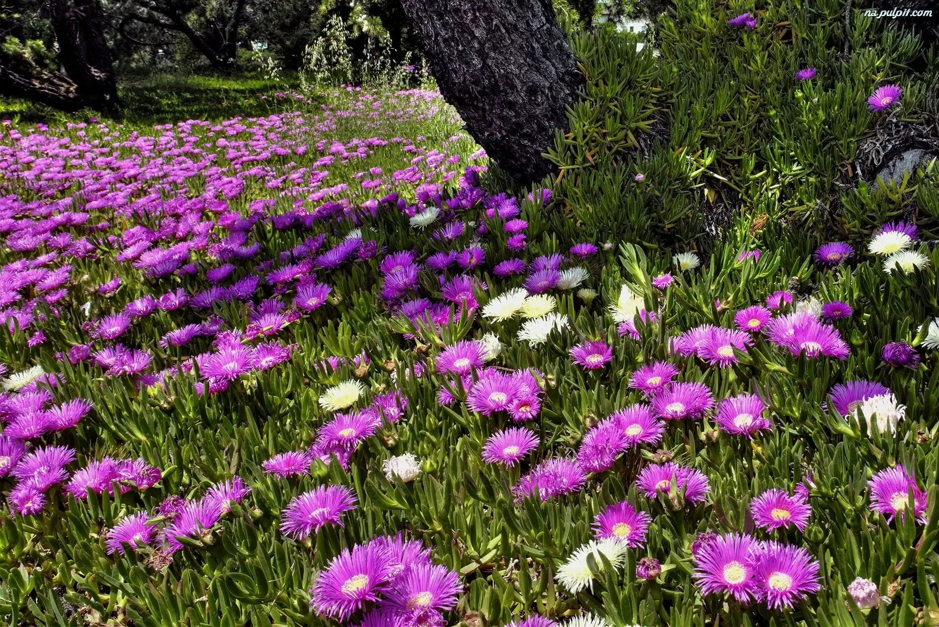 Drzewa, Kwiaty, Fioletowe, Łąka, Pień Na Pulpit