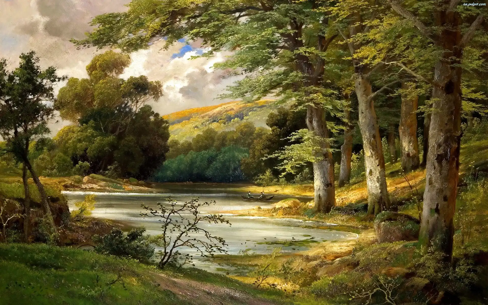 Jeziorko, Obraz, Alois Arnegger, Staw, Łódka, Las, Malarstwo, Drzewa