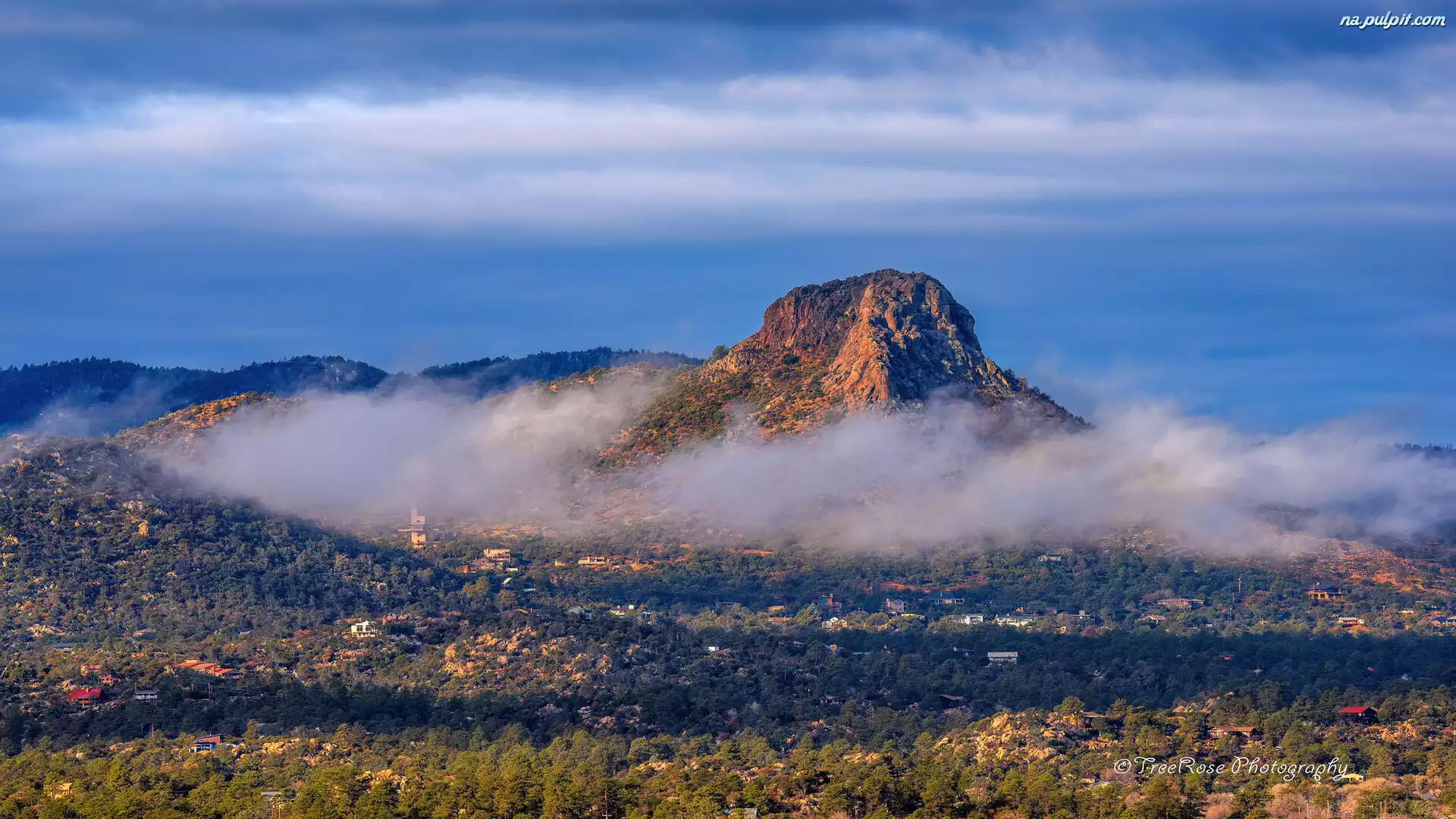 Drzewa, Thumb Butte, Góra, Stany Zjednoczone, Arizona, Prescott, Mgła Na Pulpit
