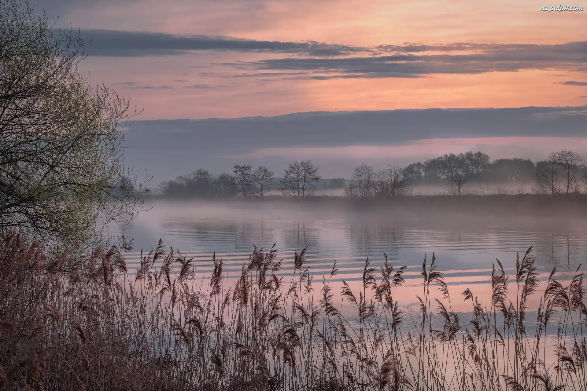 Trzciny, Wschód słońca, Mgła, Łatgalia, Łotwa, Rzeka Dubna, Poranek, Drzewa Na Pulpit