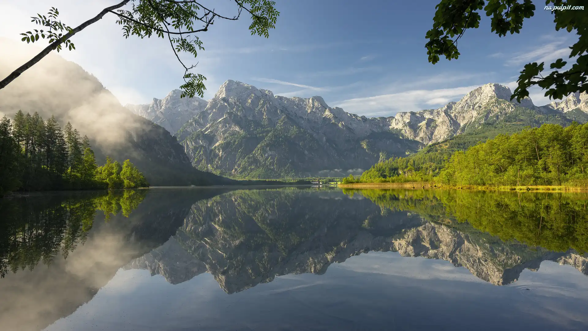Odbicie, Góry, Almsee, Drzewa, Jezioro, Austria Na Pulpit