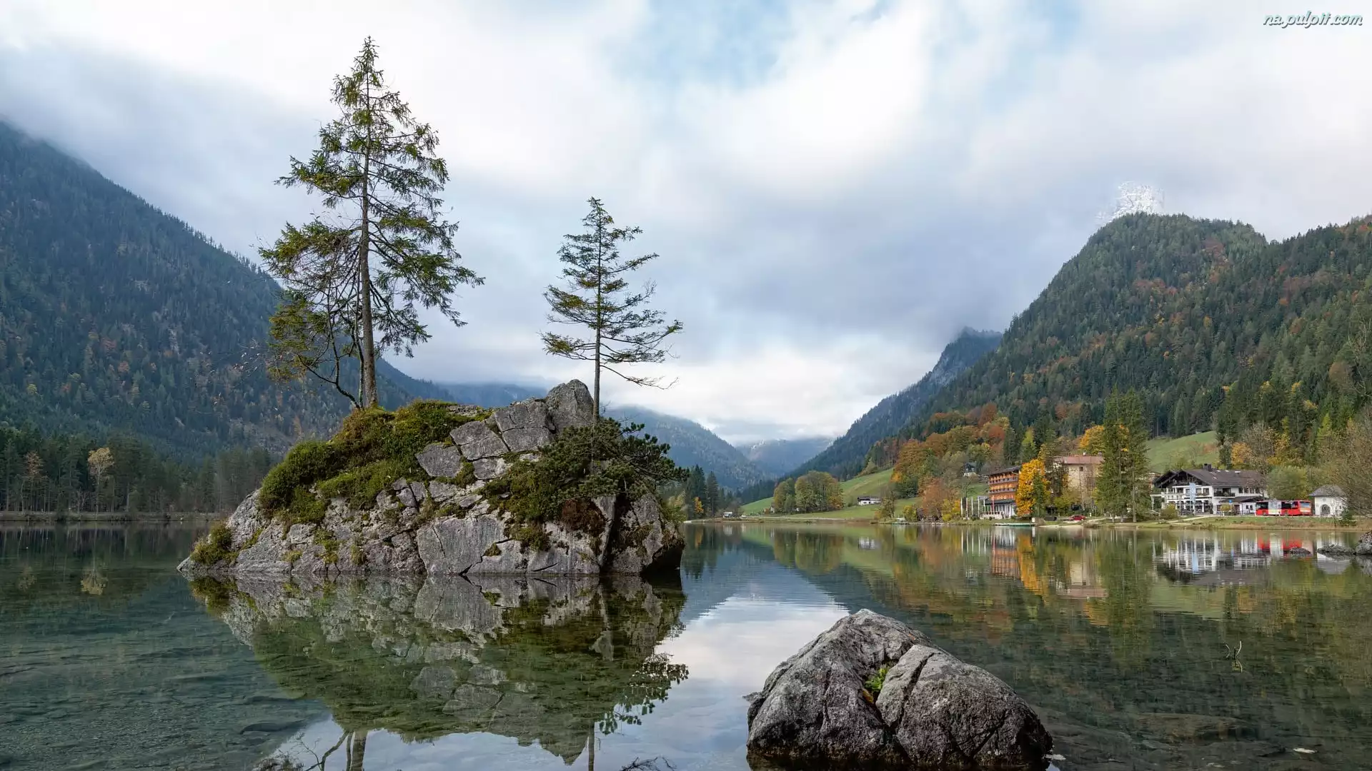 Drzewa, Jezioro Hintersee, Domy, Zalesione, Niemcy, Bawaria, Góry, Skały Na Pulpit