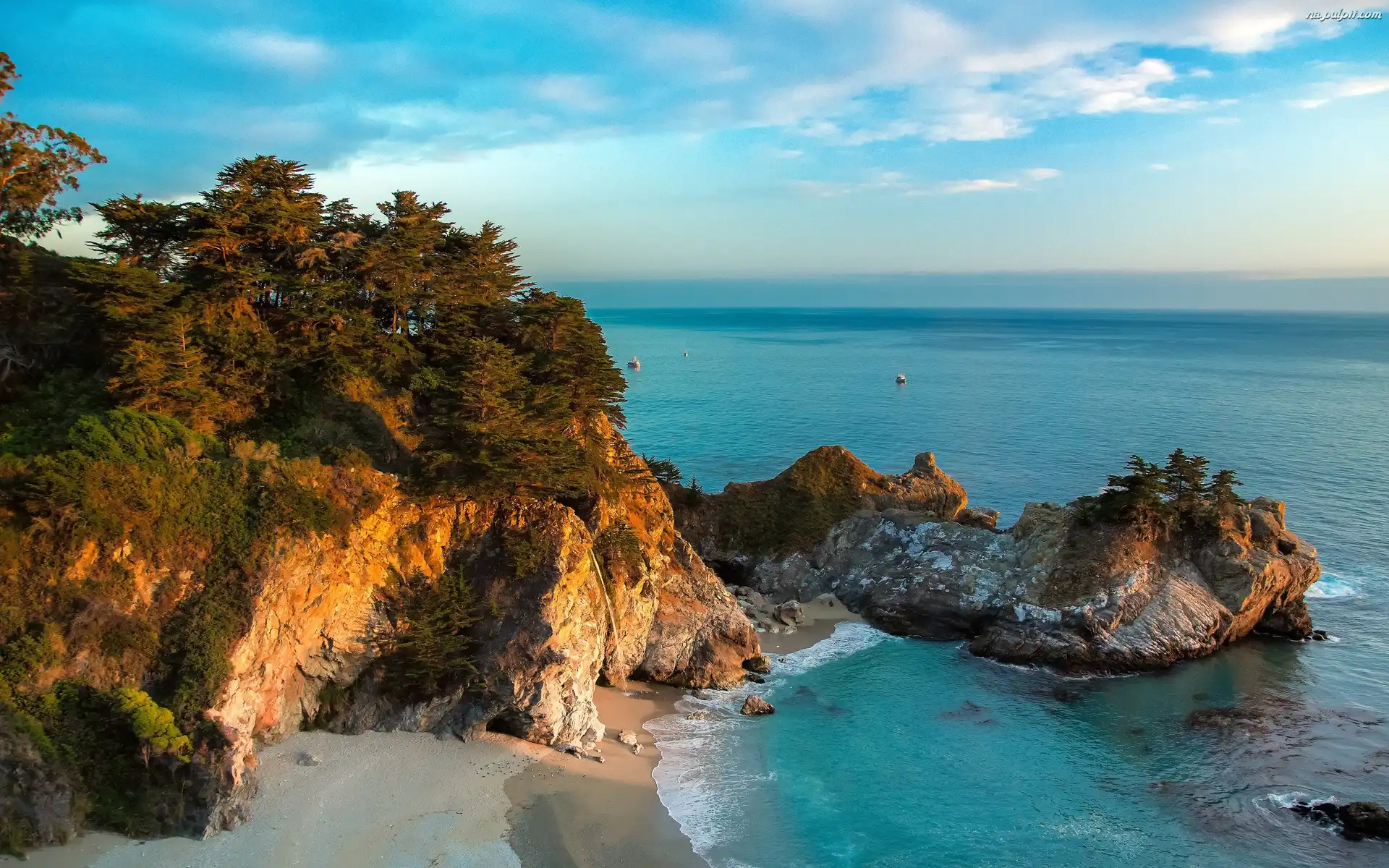 Drzewa, Morze, Brzeg, Skały Na Pulpit